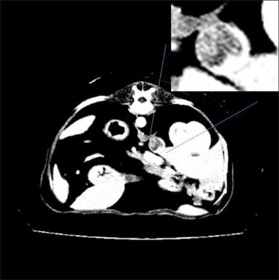 Fig. 3. Contrast-enhanced computed tomography (CT) scan; on the top, a particular of the previous image showing the structure invading CVC lumen (enhanced by contrast medium).