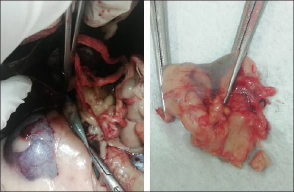 Fig. 4. Post-mortem findings showing the right adrenal gland invading the vena cava in situ and after excision. The portion of caval vessel invaded by the neoplastic gland is between the surgical forceps. DiscussionThis article documents a case of PCC of the right adrenal gland invading the CVC in a dog showing acute hypertensive encephalopathy. Adrenal tumors are common in dogs and may secrete an excessive amount of one or more types of hormones, causing tumor-related syndromes (Bertazzolo et al., 2014; Lee et al., 2020). They may originate in the cortex (adenoma, adenocarcinoma, and metastatic neoplasia) or medulla (PCCs, neuroblastoma, ganglioblastoma, and myelolipoma) (Drazner, 1987). In dogs, PPCs account for approximately 0.01%–0.1% of all canine tumors (Galac and Korpershoek, 2017), and affect middle-aged to older animals with no apparent sex or breed predilection (Barthez et al., 1997). They are usually solitary, slow-growing tumors that extend into the lumen of adjacent vessels, particularly the CVC (Barthez et al., 1997; Herrera et al., 2008; Gostelow et al., 2013). In dogs, PCCs should be considered malignant, due to the high incidence of neoplastic invasion into surrounding tissues (up to 56% of cases (Barthez et al., 1997; Kyles et al., 2003; Barrera et al., 2013; Galac and Korpershoek, 2017), and the metastatic behavior. The clinical signs associated with canine PCC are typically non-specific and depend on the active or inactive function of the tumor. When it is active, most of the associated clinical manifestations can be explained on the basis of the pharmacologic effects of catecholamines, resulting in hypertension (Twedt and Wheeler, 1984). They include, but are not limited to, polyuria, polydipsia, weakness, exercise intolerance, lethargy, respiratory signs (panting, dyspnea, coughing), episodic collapse, anorexia, weight loss, vomiting, anxiety, tremors, restlessness, irritability, depression, neurologic signs, retinal hemorrhage, retinal detachment, epistaxis, pulse deficits, systolic murmur, and arrhythmia (Gilson et al., 1994a; Barthez et al., 1997). Among arrhythmias, premature supraventricular and ventricular complexes and tachycardia are the most common. The conduction disturbances are due to myocardial damage, ischemia, and fibrosis, which are a result of prolonged exposure to catecholamines from the PCC (Mak and Allen, 2013; Edmondson et al., 2015). Some patients may present acute signs associated with a hypertensive crisis (shock, pulmonary edema, ventricular fibrillation, or cerebral hemorrhage) (Twedt and Wheeler, 1984). Our patient was presented for an acute onset of severe neurological signs due to hypertensive encephalopathy in the absence of cerebral hemorrhage. This report highlights that PCC should be included also in the differential diagnosis of dogs presented in emergencies with acute central neurological disorders. The pattern of secretion of PCCs can be persistent but more often is paroxysmal (Maher and McNiel, 1997). The pharmacologic effects of the catecholamines and the subsequent hypertension produced can be episodic. In fact, arterial hypertension has been documented in about 50% of affected patients during clinical examination (Barthez et al., 1997). Subsequently, a normotensive state during physical examination does not rule out the disease (Barthez et al., 1997). The concurrent presence of PCCs with other pathological conditions (e.g., diabetes mellitus, hyperadrenocorticism, hepatic disease, renal disease, and other neoplasms) has often been reported (Maher and McNiel, 1997; Feldman and Nelson, 2003). Hematologic, and biochemical abnormalities are usually unspecific in a patient with PCC and can derive from organ damage resulting from the hypertensive state. Thus, ante-mortem diagnosis is extremely challenging, requires a high index of suspicion and is often achieved postmortem. In our case, ambiguous clinical signs (polyuria, polydipsia, and weight loss) and systemic hypertension were reported in the past year’s history and were interpreted as consequences of CKD. Anyway, it is not possible to exclude the possibility that a non-manifest PCC was already present and that kidneys’ damage resulted from the hypertensive state and not vice-versa. In recent years, a biochemical diagnosis of PCC in dogs has become possible. It is based on the measurement of plasma and urinary catecholamines, in particular their metabolites: metanephrines (MTNs) such as free normetanephrine (NMN), and metanephrine (MN) (Kook et al., 2010; Gostelow et al., 2013; Green and Frank, 2013; van den Berg et al., 2023). Recently, in human medicine, the measurement of salivary MTNs has been shown to be a promising tool in the biochemical diagnosis of PCC (Eijkelenkamp et al., 2021) as well as a high value of urinary vanillylmandelic acid (Soler Arias et al., 2021). In veterinary medicine, van den Berg et al., (2023) have tried to determine reference intervals for plasma, urinary, and salivary-free MTNs, NMN, and 3-methoxytyramine in a large population of healthy dogs. They also assessed an upper reference limit for plasma-free NMN (3.56 nmol/l) which has shown good diagnostic performance in detecting PCC with high sensitivity and specificity. Differently, measurements of plasma and urine catecholamine concentrations showed poor diagnostic sensitivity and specificity for identifying PCC (Hickman et al., 2009; Green and Frank, 2013). Although PCC should stimulate high circulating catecholamine concentration in the patient blood or urine, levels may be normal because of their variable secretion. Furthermore, high levels of stress, excitement, or concurrent disease can falsely alter the catecholamine concentration in healthy patients (Maher and McNiel, 1997). Differently, because of their continuous neoplastic production and secretion, MTNs have higher diagnostic accuracy (Eisenhofer et al., 2004). In fact, free MTNs are catecholamine metabolites that enter the blood st