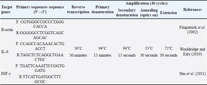 ABSTRACTBackground: Bovine respiratory disease (BRD) is a complex illness that impacts the respiratory system of domestic cattle, resulting in significant financial losses for the agriculture industry. Inactivated or modified live (MLV) pathogen vaccines are often used as a management tool to prevent and control BRD effectively. Aim: The purpose of this study is to assess the cell-mediated immune response (CMI) induced by two commercially available polyvalent vaccines, namely the MLV (cattle master gold FP) and the inactivated (CATTLEWIN-5K) vaccine. Methods: A total of 20 seronegative heifers against 4 BRD viruses, bovine alphaherpisvirus-1 (BoAHV-1), bovine viral diarrhea virus (BVDV BVDV-1: Pesti virus A; BVDV-2: Pesti virus B), bovine respiratory syncytial virus (BRSV) and bovine parainfluenza virus-3 (BPIV3) were chosen for this study. The heifers were divided into three groups. The first group (n=6) received no vaccination and was kept as a control. The second and third groups (seven heifers each) were vaccinated twice with either an MLV or inactivated vaccine. The gene expression level of interleukin-6 (IL-6) and interferon-gamma (INF-γ) was measured using real-time quantitative polymerase chain reaction on the 7th, 14th, 21st, 28th, and 60th days post-vaccination. The results were compared with the control group to study the effectiveness of the vaccines. Results: There was an upregulation in the expression level of IL-6 and INF-γ in both MLV and inactivated vaccinated groups. The level of IL-6 mRNA expression was statistically increased from the 14th and 28th days post-vaccination in MLV and inactivated vaccine groups, respectively. The expression level of INF-γ increased significantly from the 2nd and 4th weeks post-vaccination in the MLV and inactivated vaccine groups, respectively. The mean expression level of IL-6 and INF-γ mRNAs was significantly higher in the MLV vaccine group than in the inactivated vaccine group at each examination time. Conclusion: Both investigated vaccines are efficient in stimulating CMI, particularly with the MLV vaccine showing a higher preponderance in IL-6 and INF-γ. Keywords: BRD, cell mediated immunity, IL-6, INF-γ, vaccine. IntroductionRespiratory tract infections are prevalent in animal livestock, and bovine respiratory disease (BRD) is a general term for many respiratory disorders that affect the upper and lower respiratory tracts of cattle and buffaloes. BRD is a widespread issue in the beef and dairy industries, causing significant economic losses, including decreased growth performance, treatment costs, and reduced milk yield (Johnson and Pendell, 2017). BRD is a multifactorial disorder that results from a combination of various infectious agents and environmental stress factors such as transportation, high animal density, changes in diet, and unsanitary hygienic conditions (Nagy et al., 2022). Moreover, the problem of the life-long latency of some viral causes of BRD impedes the efficiency of control programs (Jones and Chowdhury, 2007). Nowadays, several bacterial and viral pathogens are proven to be involved in the disease initiation and progression. The clinical presentation of BRD infection usually starts with a common cold-like upper respiratory tract infection that either results in a full recovery or develops into life-threatening pneumonia in cases of secondary bacterial infection (Kamel et al., 2024). The most commonly found bacterial agents in clinically infected cattle with BRD include Pasteurella multocida, Mannehemia hymolytica, and Histophilus somni (Centeno-Martinez et al., 2022). Other viral agents that can initiate BRD include, Bovine alphaherpesvirus-1 (BoAHV-1), bovine viral diarrhea virus (BVDV), bovine respiratory syncytial virus (BRSV), and bovine parainfluenza virus-3 (BPIV3). BoAHV-1 infection can spread intracellularly, which allows the virus to evade circulating antibodies (Jones et al., 2011). Therefore, the evolution of cell-mediated immunity (CMI) is crucial to control the spread of the virus and the recurrence of infection, besides humeral immunity. Interferon-gamma (INF-γ) is a soluble protein that is produced mainly by T lymphocytes and natural killer cells (NK), which promotes the activation of macrophages and the destruction of virus-infected cells (Schroder et al., 2004). The expression level of INF-γ is used mainly to monitor the development of the T helper 1 (Th1) response after immunization (Zhang et al., 2011). During a natural infection or after vaccination, the body releases various cytokines, including pro-inflammatory and anti-inflammatory ones such as IL-1, IL-6, IL-8, and tumor necrosis factor (TNF). These cytokines play a crucial role in recruiting neutrophils and monocytes to the site of infection and stimulating the synthesis of acute-phase proteins, which are important during acute inflammation (McGill and Sacco, 2020). To prevent and manage BRD, vaccines made from inactivated or modified live (MLV) pathogens are commonly used. Generally, animal vaccination triggers humoral and CMI responses (Righi et al., 2023). By identifying the most effective vaccines, farmers can take proactive measures to protect their herds, minimize the risk of infection, and ensure the long-term health and productivity of their cattle. In this study, the difference in the expression level of IL-6 and INF-γ was evaluated after immunization with either MLV or inactivated vaccines against BRD. The objective of this study is to evaluate the cellular immunity produced by two commercially inactivated and MLV vaccines that are traditionally used in Egypt. Materials and MethodsAnimalsAn experimental study was conducted on 20 Holstein heifers aged 10–15 months from January 2024 to March 2024. All the heifers were raised on a private dairy farm in the Gharbia Governorate, Egypt. This farm was chosen as none of the animals had been previously vaccinated against BRD. Before the experiment began, all the animals wer