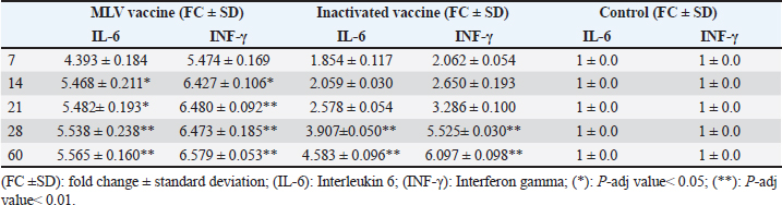 Regarding the inactivated vaccine group, the mean expression level of INF-γ increased from 2.06 to 6.09fold between the 7th and 60th days post-vaccination compared to the control group. The mean difference between these fold changes was statistically significant (p-value < 0.05). The post-hoc Dunn’s test revealed a significant elevation of INF-γ expression levels at the 28th and 60th days compared with the control group (P-adj value < 0.01). The expression level of IL-6 increased from 1.85 to 4.58 fold between the 7th and 60th days post-vaccination compared to their control counterparts. The mean difference between these fold changes was statistically significant (p-value < 0.05). The post-hoc Dunn’s test revealed a highly significant elevation of IL-6 expression level at the 28th and 60th days compared with control animals (P adj value < 0.01) (Table 2). As shown in (Fig. 2), the mean expression level of IL-6 and INF-γ mRNAs was significantly higher in the MLV vaccine group than in the inactivated vaccine group at each examination time. DiscussionBRD is a serious affliction that has a devastating impact on the health and well-being of Holstein cattle. That’s why it’s essential to understand the effectiveness of different commercial vaccines in combating this disease. Cell-mediated immunity is substantial for protection against BRD infection, especially BoAHV-1. This is due to the ability of this virus to elude humeral immunity. This study unequivocally demonstrates that both MLV and inactivated vaccine groups showed an upregulation in the expression levels of IL-6 and INF-γ. The study findings indicate that the MLV vaccine group had a significant and early increase in the expression of IL-6 mRNA from the 14th day following vaccination. On the other hand, the inactivated vaccine group exhibited a substantial increase on the 28th day post-vaccination after booster revaccination. This result came in accordance with Ridpath et al. (2010) who reported that the inactivated bovine respiratory vaccines induce less CMI than MLV vaccines and require booster revaccination to achieve a protective level of immunization. Furthermore, the mean fold change of INF-γ was significantly increased in both the MLV and inactivated vaccine groups from the second and fourth week’s post-vaccination, respectively, indicating that both vaccines are highly effective in initiating CMI through the stimulation of T helper 1 cells to produce INF-γ, importantly, the MLV vaccine displayed greater efficacy in this regard.