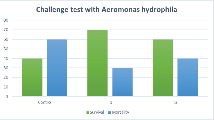 Fig. 1. The survival rate of the fish after being challenged with A. hydrophila. Saffron prophylactic groups (1.5 (T1) and 0.5 (T2) g/kg BW) The gills of fish of both treated groups did not show any aberration throughout the experiment, and the filaments and gill lamellae were well synchronized with inter-lamellar space in (T1) treatment group (Fig. 3A). However, some of the gill abnormalities appeared with (T2) saffron treatment group (Fig. 3D). The liver in (T1) had a more normal histological appearance. Hepatocytes virtually kept their polygonal structure with spherical nuclei and their regular orientation in cords (Fig. 3B), as well as in (T2) a more intact hepatopancreas contact with hepatocytes and the pancreatic acini, which are made up of pancreatic cells and afferent blood arteries, have been found to liver of (T2) group (Fig. 3E). The spleen of (T1) treated saffron group (Fig. 3C) had the typical look of red and white pulp. The (T2) spleen showed mildly dilated sinusoids and mildly activated melano-macrophage centers (Fig. 3F). Table 4. Effect of two doses of saffron on serum Immunoglobulin (IgM) after challenge with Aeromonas hydrophilia in O. niloticus (mean ± SE).