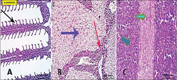 Fig. 2. Photomicrograph of control gills, liver, and spleen showing normal micromorphological structures of the corresponding organs with preserved gill filament structures (black arrows) in A, normally arranged hepatic cords (blue arrow), normal hepatopancreas (red arrow) in B, and apparently normal splenic lymphoid elements (green arrow) and mildly activated Milano-macrophage centers (Light blue arrow) in C.