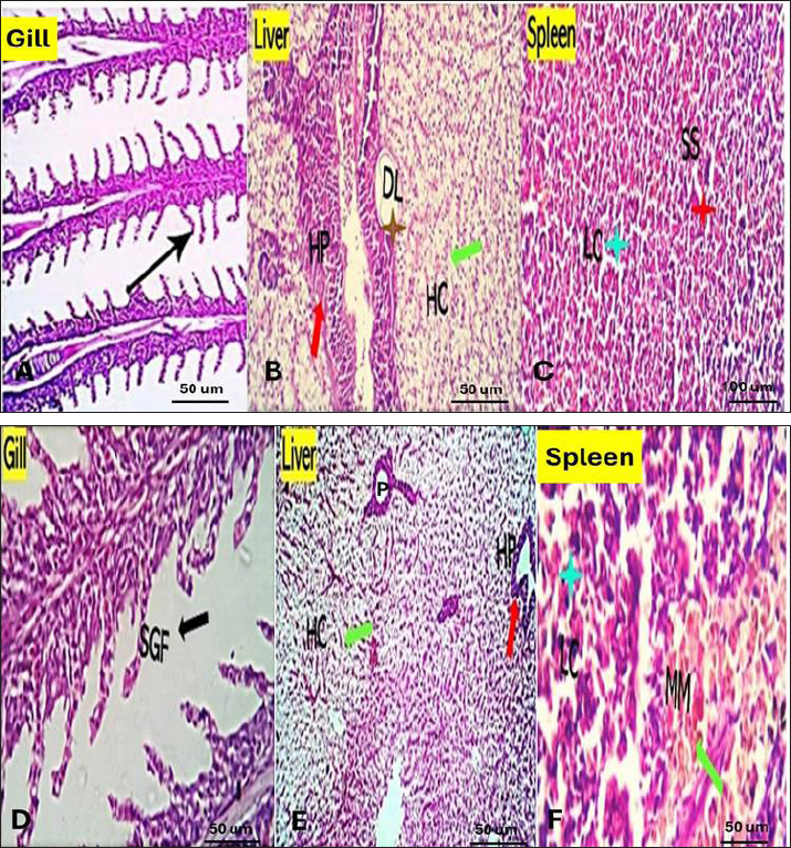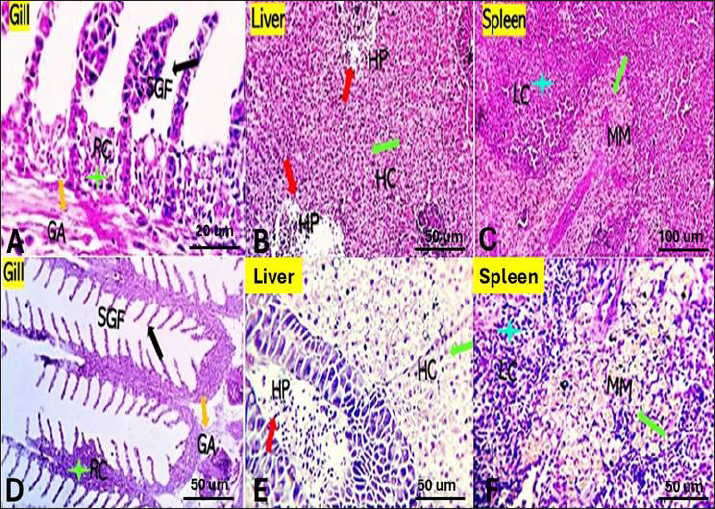 Fig. 3. Gills, Liver, and Spleen of Saffron (Crocus sativus) prophylaxis dose ( 1.5, 0.5 /Kg BW), respectively, in gills showing normal secondary filament structures in A partial adhesion of the secondary filaments are seen in (SGF, black arrow) in D. In liver the pancreatic cells (P) and afferent blood arteries, have been found to be attached to the liver. Mildly dilated lymphatics (DL, brown star) at the vicinity of the hepato-portal (HP) area and the hepatic cells (HC) in B and E. Spleen showing ill-distinctly distributed lymphoid elements (LC, light blue stars) around splenic sinusoids (SS, red star). The melano-macrophage centers (MMC,green arrow) are mildly activated, in C and F.