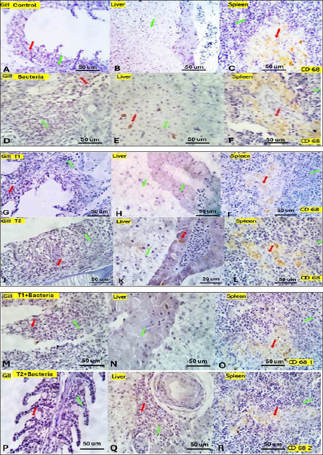 Fig. 7. Gills, Liver, and Spleen of different experimental groups, immune-stained by CD 68, showing the positively reacted inflammatory cells (red arrows) and the negatively stained cells (green arrows). Similar to our result, Hassan et al. (2018) reported among fish that herbal additives, such as turmeric, rosemary, and thyme, have been shown to improve FCR and protein efficiency ratio (PER), potentially due to their ability to enhance fat metabolism and utilization. These plants also possess high antioxidant activity, which may contribute to the activation of immune functions in fish (Ji et al., 2007). Furthermore, herbal extracts have been reported to reduce mortality against pathogenic challenges in fish (Jian et al., 2003). Unlike our findings, a study found that saffron and crocin significantly reduced body weight, food intake, and blood leptin levels in adult male Wistar rats compared to the control group and baseline (Kianmehr et al., 2022). Concerning the serum biochemical parameters, saffron supplementation significantly increased serum total protein, albumin, globulin, and lysozyme activity compared to the control group, indicating improved protein biosynthesis, metabolism, liver function, and antibody production (Sivaram et al., 2004). The elevated serum protein levels, particularly globulin and lysozyme activity, suggest enhanced immune function in fish fed with plant extracts (Misra et al., 2006; Marin et al., 2015). Our results indicate that saffron supplementation, especially at 0.5 g/kg, positively impacted serum protein levels, particularly globulin, as well as serum lysozyme activity, which may contribute to enhanced immune function in Nile tilapia. The lower albumin/globulin ratio in T2 suggests greater humoral immune system activity in this group. Similarly, elevated serum total protein levels can be linked to the innate immune response in fish that are fed on diets typically enhanced with immunostimulants (Wiegertjes et al., 1996; Rudneva et al., 2011). Immunostimulants can activate immune systems by enhancing the number of phagocytes, activating phagocytes, or increasing the synthesis of involved molecules. In a study by Hassan et al. (2018), fish fed with turmeric, rosemary, and thyme exhibited elevated phagocytic activity, suggesting a stronger innate response (Nayak et al., 2004). Using natural plant products as immunostimulants in fish farming is considered more advantageous than antibacterial drugs, as they avoid potential adverse side effects for fish, the environment, and consumers (Hassan et al., 2018). Lysozyme, an enzyme with phagocytic and antimicrobial properties, plays a crucial role in the innate immune response of fish (Alexander et al., 1992; Magnadottir, 2010). The increased serum lysozyme activity observed in the current study indicates the beneficial use of saffron supplementation in the Nile tilapia diet, promoting innate immunity against bacterial infections and pathogens. Other studies have also shown that chemical extracts of plant origin, containing bioactive molecules such as alkaloids, flavonoids, pigments, phenolics, terpenoids, and steroids, can enhance immunity and various biological activities in cultivated fish (Citarasu, 2010; Chakraborty et al., 2011, 2014). The challenge test with A. hydrophila demonstrated that the saffron-treated groups exhibited a higher survival rate of 70% and a mortality rate of 30% compared to the control group, indicating enhanced resistance to bacterial infections. This supports previous reports indicating increased resistance of fish against bacterial challenges when fed immunostimulants (Sahu et al., 2008; Harikrishnan et al., 2011). In terms of immunological parameters, saffron treatment resulted in significantly higher serum total IgM levels of 17.833 ± 2.17 compared to the control group. This increase in IgM levels highlights the stimulatory effects of saffron on antibody production. However, the percentage of IgM was significantly lower 8.327 ± 0.17 in the (T2) treated group, which could be attributed to the elevated levels of other serum proteins. Previous studies have also reported increased total serum IgM levels in fish supplemented with immunostimulants (Selvaraj et al., 2005; Sahu et al., 2008). Herbal extracts have been shown to enhance nonspecific immunity in fish by increasing phagocyte activity and serum immunoglobulin levels (Jian et al., 2003). These extracts have also demonstrated improved survival against pathogenic infections (Sivaram et al., 2004). The histopathological examination revealed normal histological structures of the gills, liver, and spleen in the control group. However, dietary supplementation of saffron at two different concentrations (0.5 and 1.5 g/kg feed) caused mild histological changes in these organs, especially at the higher dose (1.5 g/kg). In the gills, saffron treatment resulted in congested and telangiectatic capillaries with focal denudation and adhesion of secondary lamellae as well as round cell infiltration. These changes could be attributed to local inflammation and tissue damage in response to saffron intake, especially at higher concentrations. Similar gill lesions were reported in rainbow trout fed high doses of herbal extracts (Schwaiger et al., 2004; Tafi et al., 2020). However, the gill changes were milder at the lower saffron dose (0.5 g/kg), indicating limited toxicity effects at this concentration. In the liver, saffron supplementation caused mildly dilated lymphatics which may be linked to mild inflammatory reactions. The hepatopancreas showed complete necrosis in some fish fed 0.5 g/kg saffron. However, normal liver histology was also observed in some fish at this dose, suggesting limited toxicity, suggesting that treatment markedly suppressed the hepatotoxic lesions (Bukhari et al., 2018). These results indicate the importance of determining safe dosage levels when using natural extracts as feed supplements in aquaculture. In the spleen, saf