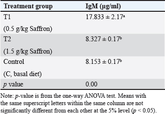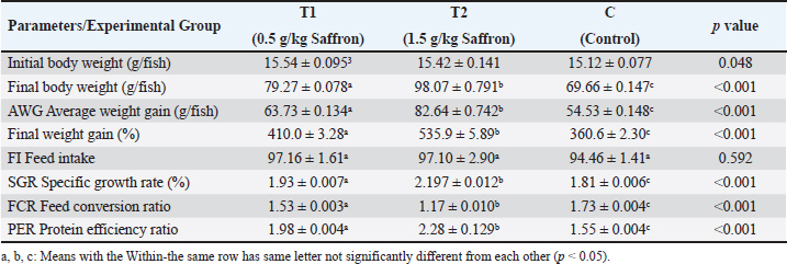 Biochemical blood parameters After 12 weeks, blood samples were taken from the caudal vessels of fish (five per replicate, 15 fish/treatment), with no anticoagulant. The blood was allowed to clot at room temperature for 2 hours before being centrifuged at 1,400 × g for ten minutes to extract serum, which was stored at −20°C until it was needed for further biochemical and immunological analysis. The total serum protein and albumin were determined according to (Chen et al., 2016), respectively. Globulin was calculated by subtracting albumin level from total protein, while serum creatinine was measured colorimetrically. Challenge test The isolation of Aeromonas species was done before the challenge, the strain was isolated from diseased Nile tilapia that suffered a normal hemorrhagic septicemia outbreak. A sample was collected from the surface and intestinal tract of fish under sterile conditions and squeezed into a sterile Eppendorf tube, which was then taken immediately for examination using the plate counting technique. The culture was selected and regularly cultured for 24 hours at 37°C on tryptic soy broth (Oxoid). After the bacterial colonies were purified, the morphology of the bacteria was determined by microscopic analysis of the cells and determination of the Gram type. Following the feeding trial, each treatment group was pooled and challenged by injection intraperitoneally with A. hydrophila at a dose of 0.1 ml of 24-hour broth containing 5 × 105 CFU/ml. A control group received 0.1 ml saline via intraperitoneal injection. Mortality and clinical signs Ten days post-injection mortality was recorded daily. The fish were also monitored for clinical signs of disease, such as loss of appetite, lethargy, skin lesions, and finally postmortem lesions. Then, survival %=100 × (final fish number/initial fish number) calculated according to Alandiyjany et al. (2022). Immunoglobulin Serum immunoglobulin M (IgM) levels were measured using an Enzyme-Linked Immunosorbent Assay (ELISA) kit and ELISA reader rt-2100c, MyBioSource.Com. Serum lysozyme activity Lysozyme activity was determined using the turbidometric assay (Biller et al., 2021). The units of lysozyme present in plasma or mucus (μg/ml) were obtained from a standard curve made with lyophilized hen-egg-white-lysozyme (Sigma). Histopathology After saffron treatment and 7 days post-challenge fishes were anesthetized by using a 0.1 ppm solution of ethyl 3-aminobenzoate methanesulfonate (Sigma-Aldrich Chemie GmbH, Eschenstrasse, product No. E10521, Germany), then fishes were necropsied, and the liver, kidneys, gills, and spleen were removed. The tissues were fixed in 10% formalin and processed for histopathology Specimens were then immediately processed to obtain 4 μm paraffin section cut from both sagittal and transverse planes. Sections were stained with Hematoxylin and Eosin stain for microscopic examination. Immunohistochemistry The immunohistochemistry analysis was carried out using standard procedures (Vannucchi, 2022). The 5 µm-thick paraffin sections were deparaffinized in Xylene and rehydrated by immersing the slides through alcohol grades step, then antigen retrieval done using a microwave and bring all slides to a boil in 10 mM sodium citrate buffer (pH 6.0), then tissue sections immersed in 3.0% hydrogen peroxide in methanol for 15 minutes, to block endogenous peroxidase activity, then the primary antibody (TNFα, NBP1-19532, dilution: 1/250) and (CD68, NB100-683, dilution: 1/1000) from Novus Biologicals (Littleton, CO, USA) incubated at room temperature for 1–2 hours. Continued the incubation overnight at 4°C in a humidified chamber. For detection, 100–400 ul Streptavidin-horseradish peroxidase reagent was added to each section and incubated for 30 minutes at room temperature, followed by 100–400 ul 3,3′-diaminobenzidine tetrahydrochloride substrate was used as chromogen, then counterstained sections in hematoxylin, dehydrated and mounted. The study used an Olympus digital camera and microscope to digitize image analysis slides of both TNFα and CD68 positive expression. The images were analyzed using Video Test Morphology 5.2 software on an Intel® Core I3®-based computer. The system measured the area percentage of Caspase-3 positive expression. Statistical analysis Data were statistically analyzed using the SPSS software version 23. A one-way ANOVA test was performed for comparison between different treatments, and a two-way ANOVA test was performed for comparison between different treatments, different times, and their interaction. Duncan's multiple ranges test was used for comparisons between means of groups. The means followed by the same letter were not significantly different from each other at the 5% probability level (p-value at 0.05). Ethical approval All experimental techniques were carried out according to the guidelines and suggestions approved by the Institutional Animal Care and Use Committee (IACUC), Faculty of Science, Zagazig University, Egypt, using the reference number (ZU-IACUC/1/F/407/2022). ResultsGrowth performance and feed efficiencyThe effects of saffron supplementation on the growth performance of Nile tilapia (Oreochromis niloticus) are presented in (Table 2). Fish supplemented with 1.5 g/kg saffron (Group T1) showed significantly (p < 0.05) higher average weight gain (AWG) compared to the control and 0.5 g/kg saffron treated group (82.64 g, 63.73 g, and 54.53 g, respectively). Moreover, the 1.5 g/kg saffron (Group T1) groups showed the greatest improvement (p < 0.05) in FCR, protein efficiency ratio (PER), and SGR than the control and 0.5 g/kg saffron treated group (Group T2). The control group showed the lowest growth performance parameters (AWG, SGR, FCR, and FER). Biochemical blood parametersThe effects of Saffron supplementation on biochemical parameters in Nile tilapia are shown in (Table 3). In terms of creatinine levels, the T1 and T2 groups showed significantly higher lev