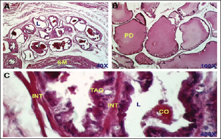 Fig. 2. Control negative group. section of the prostate gland shows normal TAG, normal INT, CO, normal SM, normal prostatic discharge (PD). H&E stain, (A)-40X. (B)-100X. (C)-400X.
