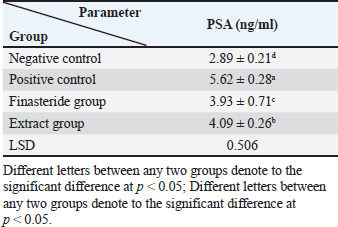 Table 3. Effect of flaxseed ethanolic extract, finasteride on level of prostate-specific antigen in serum.
