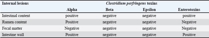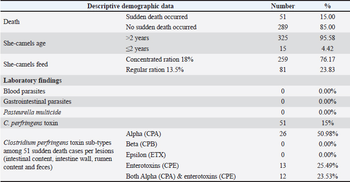 Fig. 1. Flow chart showing the numbers of total examined she-camels, suddenly dead she-camels, and types of C. perfringens toxins detected in the dead animals. Table 1. Descriptive demographic data and laboratory findings of the examined she-camels.
