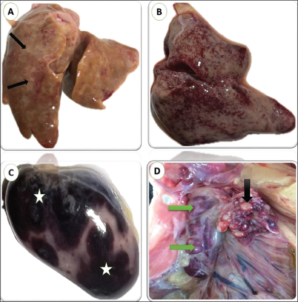 Fig. 1. gross lesions from pigeons (3 years old) naturally infected with lymphoid leukosis. A) Liver showing whitish nodules about 1–2 mm in diameter scattered all over the surface. B) Liver showing petechial hemorrhages all over the surface. C) Spleen showing severe enlargement with large hemorrhagic areas on the surface. D) Kidney shows enlargement and mottling (green arrow). Nonfunctional ovaries and regressed ovarian follicles (black arrow). Spleen Many spleens showed thickened and hyalinized capsules. The red pulp was completely replaced by diffusely infiltrating RBCs indicating massive hemorrhage that increased the size of the red pulp of the spleen and decreased the white/red pulp ratio (Fig. 3A). The white pulp is approximately decreased in size showing several lymphocytes comparison to the normal spleen. The proliferated lymphocytes showed mitotic activity and atypism. Massive propagation of large lymphoid cells all over splenic tissue particularly red pulp was seen in some tissues leading to ill demarcation between red and white pulp. (Fig. 3B). The brown granules by IHC indicate the positive reaction for the presence of specific viral particles in lymphocytes and macrophages distributed around lymphoid follicles and blood vessels. The brown granules were clear in the neoplastic cells at the white pulp (Figs. 5B). Kidneys Multifocal neoplastic aggregations of lymphoid cells were gathered around dilated blood vessels and between the deteriorated renal tubules (Fig. 4A). The renal tubules showed vacuolar degeneration, pressure atrophy, and precipitation of eosinophilic proteinaceous material in their lumens (hyaline casts) or sloughing of epithelial lining in some renal tubules together with pyknosis and karyorrhexis in some nuclei (Fig. 4B). Hypercellularity was observed in some glomeruli. Subcapsular and interstitial hemorrhages were prominent. By IHC staining, the brown granules indicate the positive response for the presence of definite viral particles in the lining epithelium of the renal tubules or macrophages at interstitial space (Fig. 5C).