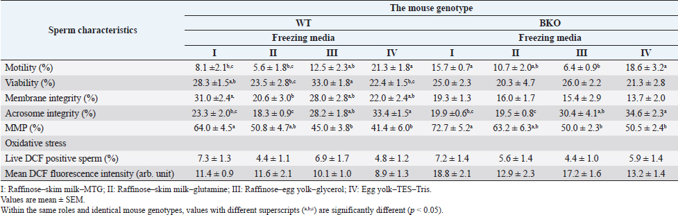 Table 3. Post-thaw evaluation of the characteristics of WT (n=24) and BKO (n=21) mouse spermatozoa subjected to different freezing media.