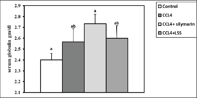 Fig. 3. Effect of LSS, CCL4 and Silymarin on serum globulin gm/dl in male rat. a,b: columns labeled with different letters display significant variations (p<0.05). The albumin/globulin ratio was substantially heightened in the CCl4 group, followed by the CCl4+Silymarin-treated animals. In contrast, there was no substantial diversity between the control and CCl4+LSS oil-treated rats (Fig. 4). The CCl4 group showed a highly significant increase (p < 0.05) in liver marker enzyme activity (ALP, AST, and ALT) compared to the control. At the same time, there was a moderate increase in CCl4+ Silymarin and CCl4+LSS oil-treated rats compared to the control (Figs. 5–7). Results in (Figs. 8–10) showed the effect of CCl4 administration with or without Silymarin or LSS on the serum level of indirect and direct bilirubin and total bilirubin, which confirmed a significant increase (p < 0.05) in total bilirubin, indirect bilirubin, and direct bilirubin in the CCl4 group compared to the control and other treated groups. There were no substantial changes between CCl4+ Silymarin and CCl4+LSS oil-treated rats in indirect and direct bilirubin. Additionally, the results showed no significant changes between the CCl4+LSS and control group in total bilirubin.