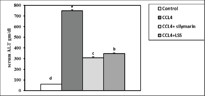 Fig. 6. Effect of LSS, CCL4 and Silymarin on Serum ALT gm/dl in male rat. a,b,c,d : columns labeled with different letters display significant variations (p<0.05).