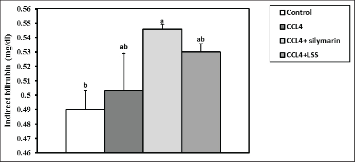 Fig. 9. Effect of LSS, CCL4 and Silymarin on serum direct bilirubin gm/dl in male rat. a,b: columns labeled with different letters display significant variations (p<0.05). DiscussionThe global burden of liver disease is significant, with over one million deaths annually. There is a need to discover effective off-the-shelf hepatoprotective agents. The current study shows that pre-treatment with LSS effectively reduces CCl4-induced liver damage in a rat model. The LSS can effectively restore liver enzymes and redox imbalance induced by CCl4. This study highlights the potential of LSS as a natural remedy for liver damage caused by toxic substances. Lagenaria siceraria has been used in ointments to treat various diseases worldwide. The plant has antioxidant, free radical scavenging, cardioprotective, and hepatoprotective properties (Kumar et al., 2012; Zahoor et al., 2021). LSS is conventionally employed in liver syndromes and diseases induced by different free radicals (Saha et al., 2011b). Hepatocellular damage increases serum enzyme indices circulated from the hepatocytes into the blood (Sreelatha et al., 2009). CCl4 induces hepatotoxicity by forming a covalent bond with membrane proteins and causing lipid peroxidation (Kanter et al., 2005; Wang et al., 2023).