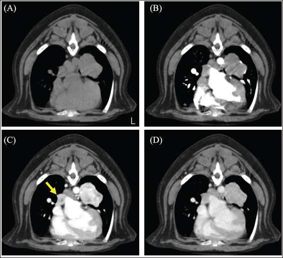 Fig. 2. CT image of the chest. (A) Plain, (B) arterial phase, (C) venous phase, and (D) equilibrium phase. The yellow arrow indicates the right middle tracheobronchial lymph node. The lymph nodes were strongly contrast-enhanced in the venous phase and rapidly washed out in the equilibrium phase. The mean CT values of lung tumors were 72.01 HU in the arterial phase, 206.57 HU in the venous phase, and 132.17 HU in the equilibrium phase. On day 51, the dog underwent a left caudal lobectomy of the lung. The subject was premedicated with atropine (40 μg/kg) injected subcutaneously and fentanyl (3 μg /kg) and ketamine (0.5 mg/kg) intravenously (IV). General anesthesia was induced with intravenous propofol and maintained by propofol-based total intravenous anesthesia accompanied by fentanyl and ketamine infusions. The nerve stimulation-guided paravertebral block was performed at the fifth to seventh intercostal space of the left thoracic wall with 0.5% bupivacaine. A right dorsal pedal artery was percutaneously cannulated with a 24-gage catheter for invasive arterial pressure measurement. An indwelling urinary catheter was placed to measure intraoperative urine volume. The surgery was performed by opening the left fifth intercostal space. After opening the chest, the left caudal lobe mass was identified, and the vascular system was processed in the following order: the pulmonary artery, lobar bronchus of the left cranial lung lobe, and pulmonary vein. The pulmonary arteries and lobar bronchioles were examined without any problems during processing. Sudden severe hypertension (SAP, 275 mmHg; MAP, 212 mmHg; DAP, 181 mmHg) occurred during surgical manipulation for vascularization of the pulmonary veins. Suspecting the onset of a hypertensive crisis, the dog was treated with a calcium channel blocker nicardipine (Sawai Pharmaceutical Co., Ltd., Osaka, Japan) 10 μg/kg IV for antihypertensive treatment; this improved the blood pressure to SAP 132 mmHg, MAP 94 mmHg, and DAP 75 mmHg and then the surgery was continued. For the purpose of yielding hemodynamic stability, a concomitant infusion of medetomidine and nicardipine at the rate of 1 and 5 μg/kg/hr, respectively, was initiated. Nevertheless, the antihypertensive rescue with nicardipine IV was repeated, thereafter, required because of repeatedly occurred hypertension (SAP, >200 mmHg) during the procedure of the mass. As the vascular processing of the mass progressed, the hypertension resolved, and the blood pressure stabilized (SAP 111 mmHg; MAP 74 mmHg; DAP 58 mmHg).