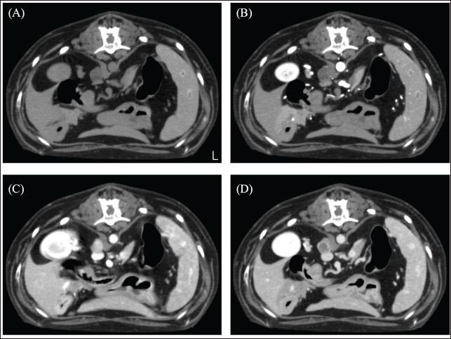 Fig. 1. CT image of the chest. (A) Plain, (B) arterial phase, (C) venous phase, and (D) equilibrium phase. The mass was in contact with the left cranial lobe, was strongly contrast-enhanced in the venous phase, and rapidly washed out in the equilibrium phase.