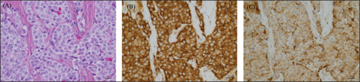 Fig. 4. High-power microscopic images of the pulmonary mass. (A) On H&E, the mass is composed of densely packed polyhedral cells compartmentalized by a fibrovascular stroma. The neoplastic cells have round nuclei and moderately abundant, eosinophilic granular cytoplasm. There is moderate anisokaryosis, and nuclear chromatin is coarsely granular with 1-2 small nucleoli. The neoplastic cells are diffusely positive for Synaptophysin (B) and Chromogranin A (C). Although the imaging findings in this case suggested a neuroendocrine tumor, a catecholamine-producing tumor was not suspected until a hypertensive crisis occurred during left pulmonary mass removal. Hypertensive crisis is a complication of pheochromocytoma and paraganglioma (Galac and Korpershoek, 2017; Ng et al., 2023). During mass removal, the dog suddenly developed severe hypertension due to catecholamine release. Nicardipine, a vasoselective calcium channel blocker, was adopted for antihypertensive rescue as an alternative to phenoxybenzamine, which was not available at that time. Nicardipine is commonly utilized for hypertensive urgency in the perioperative period as well as controlling hypertension induced by pheochromocytoma in human patients (Arai et al., 1986; Biassoni et al., 2020; Groeben et al., 2020). In dogs, there have been reports of the use of nicardipine for the antihypertensive treatment of experimentally induced hypertension, which has shown usefulness (Akashi et al., 2024). The present case indicated that nicardipine may successfully alleviate hypertension induced by catecholamine-producing neuroendocrine carcinoma also in dogs. The blood pressure stabilized after the removal was completed. The patient is still alive 580 days postoperatively. This is a survival time comparable to previous reports of paragangliomas and longer than that of pheochromocytoma of the lung. The urinary metanephrine (MN) and NMN levels measured in this case have been reported to help differentiate pheochromocytomas (Sasaki et al., 2021). The dog had a high MN/Cre ratio of 904 and an NMN/Cre ratio of 6,299, suggesting that this lung mass was a catecholamine-producing tumor. The dog also had a right adrenal mass, and the possibility of catecholamine release from the adrenal mass could not be ruled out. However, this was unlikely based on imaging findings. Therefore, the catecholamine level decreased when the patient was rechecked at the 1-month checkup after removing the lung mass. Thus, the catecholamine release associated with this intraoperative hypertensive crisis was thought to have occurred in the left lung mass. Based on these findings, the patient was diagnosed with primary paraganglioma of the lung. Postoperatively, the NMN/Cre ratio was mildly elevated to 266, which may reflect the metastatic findings of a pulmonary mass in the middle tracheobronchial lymph nodes. Regardless of their subtype, pulmonary tumors are often asymptomatic (Ogilvie et al., 1989). However, when neuroendocrine tumors are suspected on preoperative CT scans, urinary MN, and NMN levels can be measured preoperatively to evaluate catecholamine-producing potential. These preoperative examinations may predict the occurrence of hypertension due to intraoperative procedures, suggesting that they may contribute to safer perioperative management. Urinary MN and NMN levels should also be measured postoperatively to diagnose primary lung paragangliomas accurately. AcknowledgmentsPathological evaluation was performed at the Veterinary Pathology Diagnostic Center. We want to acknowledge Dr. Mika Tanabe (Diplomate, American College of Veterinary Pathologists) for the pathological diagnosis. Conflict of interestThe authors declare that there is no conflict of interest. FundingThis research received no specific grant. Author’ contributionsConceptualization, Y. G., S. M., N. A., T. K., Y. O., and T. A.; methodology, S. M.; formal analysis, Y. G. and S. M.; investigation, S. M., N. A., T. K., K, K., and Y. O.; data curation, Y. G. and S. M.; writing—original draft preparation, Y. G.; writing—review and editing, Y. G., S. M., N. A., T. K., Y. O., and T. A.; supervision, S. M. and T. A. All authors have read and agreed to the published version of the manuscript. Data availabilityAll data supporting the findings of this study are available within the manuscript. ReferencesAkashi, N., Murahata, Y., Tsuno, S., Kanazawa, A., Hikasa, Y. and Imagawa, T. 2024. Nicardipine constant rate infusion alleviates the cardiovascular effects of dexmedetomidine infusions without affecting the minimal alveolar concentration in sevoflurane-anesthetized dogs. Res. Vet. Sci. 172, 105254. Arai, T., Hatano, Y., Ishida, H. and Mori, K. 1986. Use of nicardipine in the anesthetic management of pheochromocytoma. Anesth. Analg. 65(6), 706–708. Barthez, P.Y., Marks, S.L., Woo, J., Feldman, E.C. and Matteucci, M. 1997. Pheochromocytoma in dogs: 61 cases (1984–1995). J. Vet. Intern. Med. 11, 272–278. Biassoni, R., Di Marco, E., Squillario, M., Barla, A., Piccolo, G., Ugolotti, E., Gatti, C., Minuto, N., Patti, G., Maghnie, M. and d'Annunzio, G. 2020. Gut microbiota in T1DM-onset pediatric patients: machine-learning algorithms to classify microorganisms as disease linked. J. Clin. Endocrinol. Metab. 105(9), 407. Brodey, R.S. and Craig, P.H. 1965. Primary pulmonary neoplasms in the dog: a review of 29 cases. J. Am. Vet. Med. Assoc. 147, 1628–1643. Choi, U.S., Alleman, A.R., Choi, J.H., Kim, H.W., Youn, H.J. and Lee, C.W. 2008. Cytologic and immunohistochemical characterization of a lung carcinoid in a dog. Vet. Clin. Pathol. 37, 249–252. Fukushima, K., Fujiwara, R., Yamamoto, K., Kanemoto, H., Ohno, K., Tsuboi, M., Uchida, K., Matsuki, N., Nishimura, R. and Tsujimoto, H. 2016. Characterization of triple-phase computed tomography in dogs with pancreatic insulinoma. J. Vet. Med. Sci. 77, 1549–1553. Galac, S. and Korpershoek, E. 2017. Pheochromocytomas and paragangliomas in humans and dogs. Vet. 