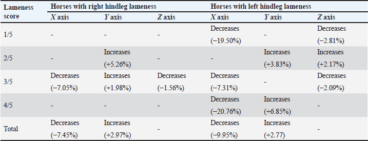 In order to explore the relationship between the mean number of impulses recorded by the Lameness detector 0.1 and the AAEP lameness score of the studied horses, correlations were calculated for each hindleg, before and after performing the intra-articular anesthesia of the tarsal joint (Table 6). Table 5. Comparisons of the mean values of the impulses recorded by the Lameness detector 0.1 on its three axes according to the lame hindleg of the assessed horses, regardless of their lameness scores, before and after intra-articular anesthesia.