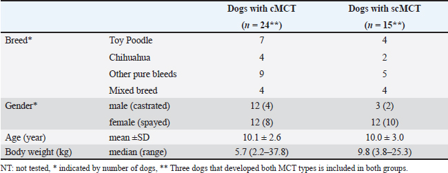 Open Vet. J.. 2024; 14(11): 2774-2779 Open Veterinary Journal, (2024), Vol. 14(11): 2774-2779 Research Article Clinical differentiation of cutaneous and subcutaneous mast cell tumors in dogs: A pilot studyTeruo Itoh1,2*, Atsuko Kojimoto1,2, James Chambers3, Kazuyuki Uchida3 and Hiroki Shii21Aoba Animal Hospital, 92-1, Aoba-cho, Miyazaki 880-0842, Japan 2Division of Animal Medical Research, Hassen-kai, 2-27 Onozaki, Saito, Miyazaki 881-0012, Japan 3Department of Veterinary Pathology, Graduate School of Agricultural and Life Sciences, The University of Tokyo, 1-1-1 Yayoi, Bunkyo-ku, Tokyo 113-8657, Japan *Corresponding Author: Teruo Itoh. Aoba Animal Hospital, Miyazaki, Japan. Email: itohteruo [at] gmail.com Submitted: 13/06/2024 Accepted: 17/10/2024 Published: 30/11/2024 © 2024 Open Veterinary Journal