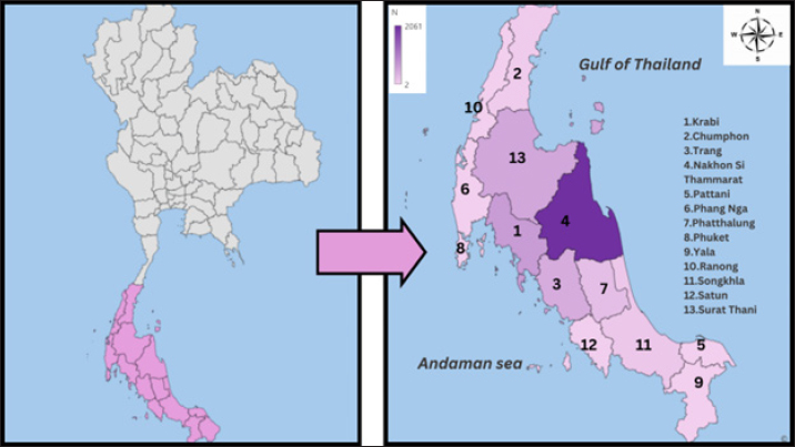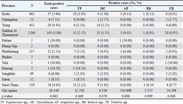 Table 6. The prevalence of hemoparasitic infections in the provinces of southern Thailand, showing the number of positive cases and their corresponding percentages.