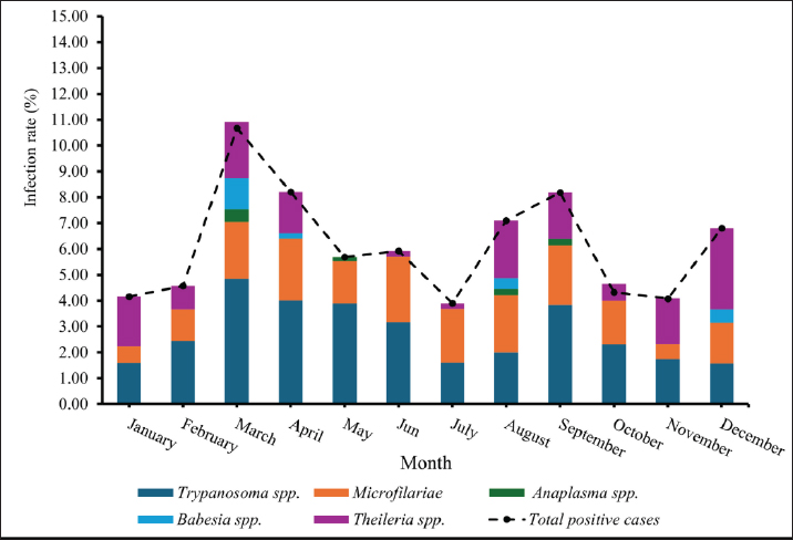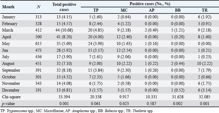 Fig. 3. Monthly distribution of hemoparasitic infections in fighting bulls. Table 4. The prevalence of hemoparasitic infections on different coastlines in southern Thailand, reported as positive numbers and percentages.