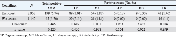 Season-wised hemoparasitic infectionsOur results showed significant variations in the prevalence of BB and TR during different seasons on the East Coast (p < 0.05). BB and TR showed higher infection rates during the summer (0.67% and 2.21%) than in the rainy season (0.15% and 1.17%). On the West Coast, there were no significant seasonal differences in the prevalence of the tested parasites, except for TR, which approached significance with a higher infection rate during the rainy season than in the summer (Table 5). Hemoparasitic infections observed in distinct provincesThe results revealed significant geographical variations in infection rates (Table 6). TP had the highest prevalence in Krabi (3.0%) and the highest number of cases in Nakhon Si Thammarat (2.5%). MC infections were most common in Krabi (1.4%) and Nakhon Si Thammarat (1.6%), with other provinces reporting lower rates. AP was rarely detected, with minimal cases primarily in Nakhon Si Thammarat. BB was found exclusively in Nakhon Si Thammarat and Krabi. TR had sporadic occurrences, mainly in Krabi and Phatthalung (0.9%). Statistical analysis discovered significant variations in the prevalence of TR and BB, but not for MC, AP, and TR in substantial regional differences. Table 5. Seasonal prevalence of hemoparasitic infections on both coastlines (East and West) in southern Thailand, shown as positive cases and percentages.
