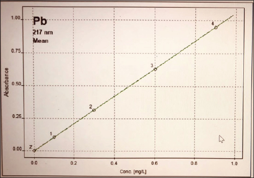 Fig. 2. Pb calibration curve. Ethical approvalThe authors adhered to all relevant international, national, and institutional guidelines for the care and use of animals. ResultsThe values obtained from the present study for selected heavy metals in liver of C. carpio are given in Table 1 and Figure 4. The results of the current study showed that all liver samples of C. carpio in 100% had a concentration of As and Pb less than the permissible limit of the WHO. The permissible limits for As and Pb set by WHO (1990) are (0.5 ppm) and (1.5 ppm), respectively. While Hg concentration in four liver samples (L1, L2, L3, L4) in 40% was within the permissible limit of WHO and in six liver samples in 60% was higher than the permissible limit of WHO (1990). The permissible limit for Hg set by WHO (1990) is (0.14 ppm).