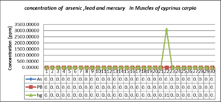 Fig. 6. Concentration of Arsenic, Lead, and Mercury in muscle of C. carpio. This results agree with Carlos et al. (2020) who found that heavy metal concentrations (Hg, Pb, Cu, As, Cd, and Zn) in fish muscle of (Mugil incilis, Cathorops mapale, Eugerres plumieri, Centropomus undecimalis, and Elops smithi) were low compared to the maximum levels for fish consumption set by national and international monitoring organizations, while disagree with Robeena et al. (2019) who found that bioaccumulation of heavy metal (As), Cadmium (Cd), Iron (Fe), and (Pb) in Channa punctatus in Ramganga river in India has surpassed the levels that are safe for human consumption.