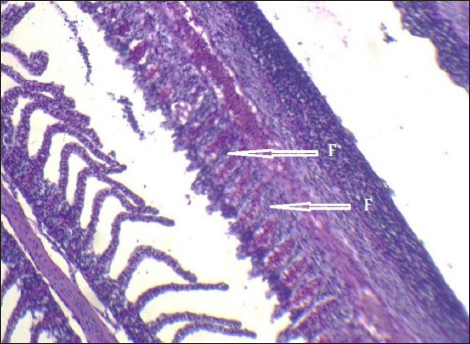 Fig. 10. Histopathological sections of gill of C. carpio showing complete fusion in the secondary lamellae (F) (H&E X40). Mercury is a hazardous heavy metal that is not necessary for life and is hard to eliminate. Long-term storage in the tissues may result in lesions, neurological dysfunction, and changes in behavior and cognition (Authman et al., 2015). Additionally, during pregnancy, mercury can pass through the placenta and reach the fetus, which may have an impact on the central nervous system’s development (Renieri et al., 2014). The current study’s findings demonstrated that mercury was present in C. carpio liver, gill, and muscle samples that were taken from the local Baqubah markets, and that the mercury’s bioaccumulation had above the WHO’s (1990) allowable level of 0.14 ppm.