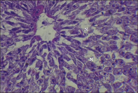 Fig. 15. Histopathological sections of liver of C. carpio showing necrosis (N) (H&E X40).