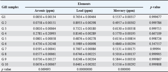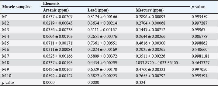 Table 6. Mean ± SE, range, minimum, and maximum value of heavy metal content in muscle samples of C. carpio.