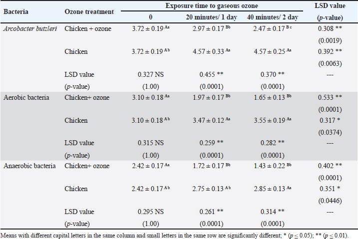 Table 3. Effect of O3 gas on the total aerobic and anaerobic bacterial counts (log CFU/g) of non-inoculated chicken meat with A. butzleri during storage at 3°C–7°C.