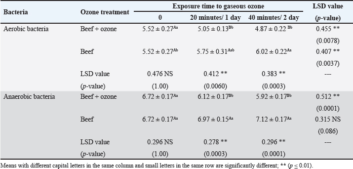 Table 4. Effect of O3 gas on the total aerobic and anaerobic bacteria counts (log CFU/g) of non-inoculated cattle meat with A. butzleri during storage at 3°C–7°C.