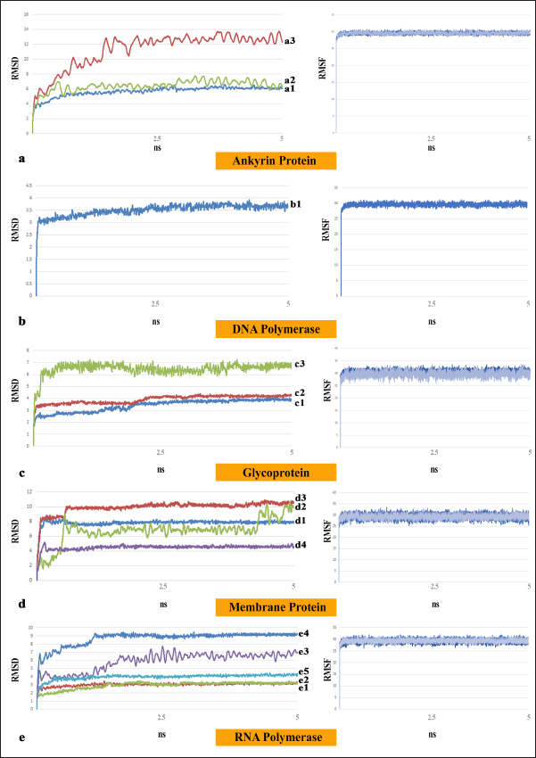 Fig. 3. Interactome profile of Ankyrin protein (a1 – a3), DNA polymerase (b1), Glycoprotein (c1 – c3), membrane protein (d1 – d4) and RNA polymerase (e1 – e5); with Vidarabine. Additionally, RNA polymerase interactions (NP_150489.1) showed 13 in all, 3 of which were covalent hydrogen bond, 2 Pi-Cationa, and 1 Cation Hydrogen bond with corresponding binding free energy of −6.7 kcal/mol; A total of 13 interactions were detected in the RNA polymerase (NP_150503.1) with corresponding binding free energy of −6.9 kcal/mol; on the other hand RNA polymerase (NP_150505.1) showed total 12 interactions with corresponding binding free energy of −8.9 kcal/mol; RNA polymerase (NP_150519.1) showed total 13 interactions with corresponding binding free energy of −6.1 kcal/mol; Lastly total 10 interactions were detected with RNA Polymerase (NP_150530.1) with corresponding binding free energy of −5.9 kcal/mol. A total number of interactions of apigenin-4’-glucoside with Ankyrin protein, DNA polymerase, Glycoprotein, membrane protein and RNA polymerase were represented in Figure 4. The highest number of interactions were documented in case of Apigenin-4’-glucoside when compared with Vidarabine. Interactome profile of VidarabineVidarabine also emerged as one of the most promising drug candidates, exhibiting favorable pharmacokinetic properties. The subsequent molecular docking analyses involved a total of sixteen docking complex generation (Fig. 3), exploring the interactions between Vidarabine and various LSDV proteins, including ankyrin proteins, DNA polymerase, RNA polymerase, membrane proteins, and glycoproteins. Three docking interactions were investigated using Vidarabine, the ankyrin protein (NP_150581.1) exhibited a total of 12 interactions, with corresponding biding free energy of -6 kcal/mol; the ankyrin protein (NP_150582.1) showed 12 interactions in all, with corresponding biding free energy of −4.9 kcal/mol; A total of 13 interactions were detected in the ankyrin protein (NP_150586.1), with corresponding biding free energy of −5.8 kcal/mol. In the case of DNA polymerase, a single docking interaction was studied (NP_150473.1) and revealed a total of 12 interactions with providing insights into the binding energy of −5.8 kcal/mol with apigenin-4’-glucoside. Three docking study were carried out for glycoprotein proteins, unraveling intricate ligand-protein interactions; glycoprotein (NP_150556.1) showed total 10 interactions with corresponding binding free energy of −5.2 kcal/mol; with glycoprotein (NP_150557.1) revealed total 11 interactions with corresponding binding free energy of −5.7 kcal/mol; and lastly glycoprotein (NP_150560.1) showed total 5 interactions with corresponding binding energy of −3.4 kcal/mol. Membrane proteins were the focus of four docking interactions; first membrane protein (NP_150534.1) showed total 9 interactions with corresponding binding free energy of −4.7 kcal/mol; with corresponding binding free energy −3.5 kcal/mol membrane protein (NP_150538.1) showed total 5 interactions; membrane protein (NP_150539) showed total 7 interactions with binding free energy of −4.1 kcal/mol; membrane protein (NP_150546.1) showed total 5 interactions with binding free energy of −3.9 kcal/mol. Additionally, RNA polymerase interactions (NP_150489.1) showed 9 in all with corresponding binding free energy of −4.7 kcal/mol; A total of 10 interactions were detected in the RNA polymerase (NP_150503.1) with corresponding binding free energy of −5.6 kcal/mol; on the other hand RNA polymerase (NP_150505.1) showed total 4 interactions with corresponding binding free energy of −4.2 kcal/mol; RNA polymerase (NP_150519.1) showed total 9 interactions with corresponding binding free energy of −4.6 kcal/mol; Lastly, total 10 interactions were detected with RNA Polymerase (NP_150530.1) with corresponding binding free energy of −5.3 kcal/mol. Total number of interactions Vidarabine with Ankyrin protein, DNA polymerase, Glycoprotein, membrane protein, and RNA polymerase were represented in Figure 4. Molecular dynamics (MD) simulationThe MD simulation (Five nanoseconds) for the docking complexes resulted RMSD values which provided key insights into the stability and dynamic behavior of the apigenin-4’-glucoside with different LSDV protein interactions (Fig. 5). The RMSD analysis revealed the robustness of docking complexes maintained a relatively stable trajectory throughout the simulation time. The deviations from the initial structures remained within acceptable ranges, indicating a consistent and equilibrium state of the ligand-protein complexes. This observation suggested that the binding interactions between apigenin-4’-glucoside and LSDV proteins were robust and persist minimal structural fluctuations. Complementary to RMSD, the RMSF analysis offered a detailed perspective on the flexibility and fluctuation patterns of specific residues within the LSDV proteins during the simulation. Significantly, the conserved binding sites displayed minimal fluctuation, confirming the reliability and sustained binding of apigenin-4’-glucoside with the target proteins. DiscussionLumpy skin disease is a serious globally distributed infection that is classified as threatening for all ages and breeds of cattle. The integration of molecular docking and MD simulations has unveiled compelling insights into the promising antiviral properties of apigenin-4’-glucoside against LSDV. The initial screening based on ADMET parameters identified apigenin-4’-glucoside as a stand-out candidate, showcasing favorable pharmacokinetic attributes. Subsequent molecular docking analyses, involving total 15 simulations, interactions between apigenin-4’-glucoside and key LSDV proteins like Ankyrin proteins, DNA polymerase, RNA polymerase, Membrane proteins, and Glycoproteins. Apigenin- 4’ –glucoside, Myricetin, and Abyssinone-V were already reported as antiviral compounds.