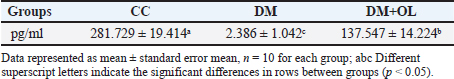 Table 2. Effect of diabetes and olive leaves extract on GSH (μg/ml) in brain tissue of adult male rats.