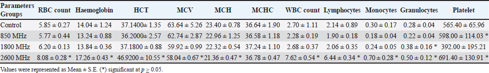 Table 2. Effect of LTE 850, 1800 and 2600 MHz exposure for 4 weeks on haematological values.