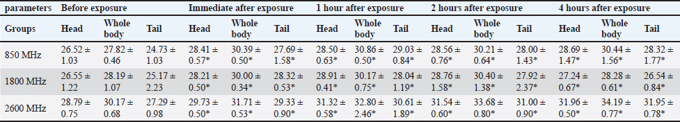 For the 1800 MHz group, Significant temperature increases were observed immediately after exposure (32.51°C ± 0.46°C, 35.65°C ± 0.37°C, 34.44°C ± 0.56°C) and remained elevated up to 4 hours post-exposure (p < 0.05). For the 2600 MHz group, post-exposure temperatures showed a significant rise immediately (33.75°C ± 0.37°C, 35.40°C ± 0.27°C, 33.53°C ± 0.88°C) and continued to show significant increases at 1 and 4 hours (p < 0.05). Table 6 details the thermographic analysis of subjects exposed to LTE frequencies of 850, 1800, and 2600 MHz for 4 weeks, with temperatures measured at the head, whole body, and tail. For post-exposure of the 850 MHz Exposure group, temperatures increased significantly across all time points, with immediate post-exposure readings at 28.41°C ± 0.57°C, 30.39°C ± 0.50°C, and 27.69°C ± 1.58°C (p < 0.05). For 1800 MHz Exposure, significant temperature increases were noted immediately after exposure and persisted up to 4 hours (p < 0.05). For 2600 MHz Exposure, significant rises in temperature were recorded at all time points post-exposure (p < 0.05). Table 7 shows the thermographic analysis for subjects exposed to LTE frequencies of 850, 1800, and 2600 MHz for 6 weeks, with temperatures recorded at multiple time intervals. For 850 MHz Exposure, significant increases were seen immediately post-exposure, with the head temperature at 33.67°C ± 0.22°C (p < 0.05). For 1800 MHz Exposure, post-exposure temperatures showed significant increases at all time points (p < 0.05). For 2600 MHz Exposure, post-exposure measurements showed significant increases immediately and up to 4 hours post-exposure (p < 0.05). Table 8 summarizes the thermographic analysis for subjects exposed to LTE frequencies of 850, 1800, and 2600 MHz for 8 weeks, with temperature data collected before and after exposure. For 850 MHz Exposure, significant temperature increases were recorded, with the immediate post-exposure head temperature at 28.79°C ± 0.58°C (p < 0.05). For 1800 MHz Exposure, significant increases were observed immediately and at subsequent time points (p < 0.05). For 2600 MHz Exposure, significant increases were noted immediately post-exposure and persisted at later time points (p < 0.05) (Fig. 2). DiscussionThe current findings highlight significant hematological changes induced by long-term exposure to LTE frequencies of 850 MHz, 1800 MHz, and 2600 MHz. A previous work stated that RF-EMF affects negatively on hematological values at a frequency of 2.45GHz indicating that this effect is directly related to the altered frequency at a high range (Vijayalaxmi et al., 2001). Other studies found that both 0.9 and 1.8GHz exposure leads to significant changes in Hb, and RBC total count in exposed animals in respect to control animals (Dasdag et al., 2003; Trošić et al., 2012). Table 5. Thermographic image analysis of exposure to LTE 850, 1800 and 2600 MHz for 2 weeks.