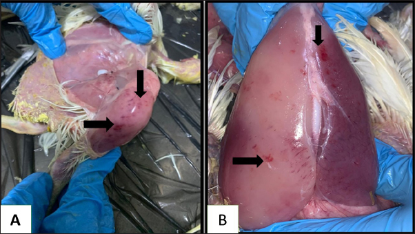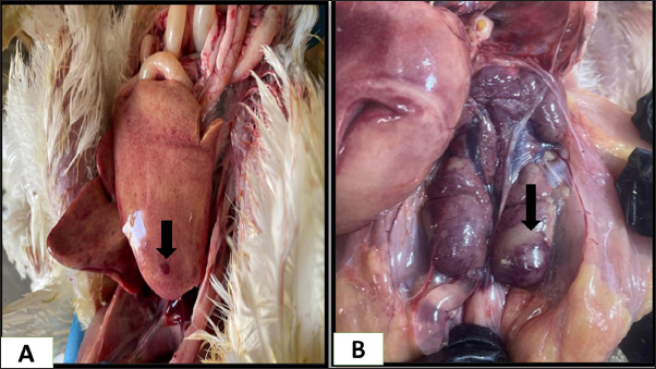Fig. 2. Gross picture of chicken infected with mycotoxins (A): liver appears pale, enlarged, and brittle with petechial hemorrhage. (B) chicken kidneys appear pale, enlarged pale, enlarged, and hemorrhagic. Table 2 illustrates the results, which showed a significant increase in the means of AST, ALT, and uric acid in the infected chicken group recorded 44.48 IU/ml, 23.4 IU/ml, and 9.29 mg/dl, respectively, in comparison to the means values recorded in the healthy chicken group (41.35 IU/ml, 20.95 IU/ml, and 7.61 mg/dl). The results also showed a significant decrease in the means values of total protein and cholesterol in the infected chicken group (2.56 g/dl and 86.3 mg/dl, respectively) in comparison with the means values recorded in the healthy chicken group (3.5 g/dl, 188.7 mg/dl, respectively) (Table 3). DiscussionMycotoxins are known to be a prevalent secondary fungal metabolite contaminant in feed stuffs produced by mold and to be a substantial global issue with significant economic impact (Pappas et al., 2016). The Food and Agriculture Organization has indicated that about 1 billion metric tons of feed is destroyed annually throughout the world due to contamination with mycotoxins. This organization has estimated that 25% of agricultural crops that are used in the manufacture of feed and food products around the world are contaminated with mycotoxins.