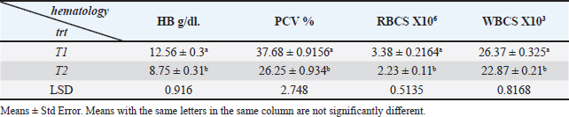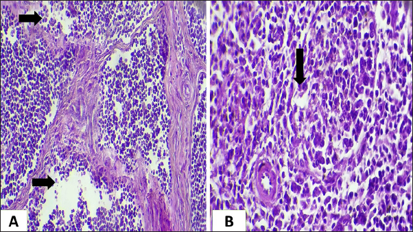 Fig. 7. Histopathological section of chicken infected with mycotoxin (A): bursa of Fabricius showing depletion of the lymphoid follicles due to lymphocytic necrosis with (black arrow). (H&E, stains, 200x). (B): spleen showing depletion in the white bulb (black arrow). (H&E, stains, 400x). Table 2. Explain the mean ± st. error of HB, PCV, RBCS, and WBCS in Mycotoxicosis chickens group and healthy chickens group.