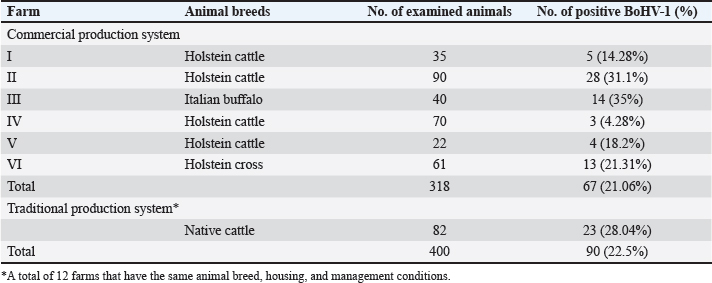 where n=Sample size, P exp=Expected true population, and d=Desired margin of error. Samples and data collectionSix commercial dairy farms and 12 smallholder farms were selected randomly for this survey. All investigated farms did not use vaccination protocol against BoHV-1. A total of 400 blood samples were collected from 360 cattle of different breeds and 40 Italian buffaloes for diagnosis of IBR infection. Out of them, 318 animals were reared in the commercial farm system, and 82 animals were reared in the traditional farm system (Table 1). The blood samples were collected aseptically from the jugular vein in sterile vacutainer tubes without anticoagulant for serum separation. All samples were transported in an ice box to the laboratory of the Virology Department, Animal Health Research Institute, Giza, Egypt. The serum samples were separated and frozen at −20°C until further examination. The data regarding the date of the visit and animals’ breed, age, sex, housing condition, and history of recent respiratory illness were recorded during sample collection. Indirect ELISABoHV-1 antibody test kits were obtained from ID vet (Innovative Diagnostics, France, Reference code: IBRS-5P, Lot No: G64). The tests were performed according to manufacturer instructions. Briefly, the antigen-coated microtiter plates were incubated with 10 µl of diluted serum samples (1:10) for 45 minutes at 37°C. The plates were washed three times with at least 300 µl of diluted washing solution (1/20 in distilled water) and incubated with 100 µl of anti-ruminant peroxidase conjugate for 30 minutes at 37°C. The plates were rewashed three times, and 100 µl of substrate solution (TMB) was added to each well for 15 minutes at 21°C. Finally, 100 µl of stop solution was added to stop the reaction. The optical density was measured by a Microtiter plate reader (Biotech 808) at a wavelength of 450 nm. The S/P percentage ≥ 60% is considered positive. Statistical analysisThe statistical analysis was performed with the SPSS program (SPSS 20 for Windows, SPSS Inc., Chicago, IL, USA). The objected explanatory variables were age, sex, d breeds of the animals, season, housing, type of stall, and history of recent respiratory manifestation. The response variable was the serological status of the examined animals (either seronegative or seropositive) for BoHV-1. The Univariate logistic regression model was used firstly to evaluate the association between each independent variable and the serological status of IBR. The predictors with p values ≤ 0.20 were retained in the final multivariate logistic regression model. The predictors with a p value < 0.05 were considered significant.