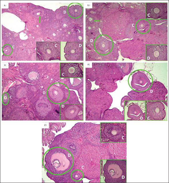 Fig. 3. Histopathological description of the antral follicles of the ovaries of white rats (R. norvegicus) given curcumin nanoparticles as a prevention of exposure to carbon black in the K−, K+, P1, P2, and P3 groups with 40× magnification HE staining. The circles and green arrows indicate the antral follicles [tertiary and de graaf follicles (C and D) observed]. In box shows the tertiary follicle (C) and follicle de Graaf (D). The negative (K−) and positive (K+) control groups were given aquades + Na-CMC 0.5% orally, while the treatment group received different doses of curcumin nanoparticles, namely, in the P1 (50 mg/kgBW), P2 (100 mg/kgBW), and P3 (150 mg/kgBW) groups. Curcumin nanoparticles can activate transcription agents, namely, nuclear-related factor 2, which plays an important role in the transcription of phase II detoxification enzymes such as glutathione S-transferase, NAD(P)H Quinone Oxidoreductase 1, and glutamylcystein synthetase. These phase II detoxification enzymes function to protect cells from free radicals, especially from the reactive oxygen species (ROS) group (Reyes et al., 2013). Under normal circumstances, Nrf2 is inactivated in the cytosol by binding to Kelch-like ECH-associated protein 1 (González-Reyes et al., 2013). By activating Nrf2, curcumin helps modulate cellular antioxidant responses, increase the production of phase II detoxification enzymes, and reduce oxidative stress (Ghafouri-Fard et al., 2022). However, in the P3 group, there was a decrease in the average antral follicle, which was far from normal conditions. This can be affected because exposure to carbon black can affect the work of hormones such as FSH, which plays a role in stimulating follicle development. The highest dose in group P3 was less effective. This is related to the pharmacokinetics of nanoparticles, biodistribution, and side effects related to their clearance (Wei et al., 2018). The clearance of nanoparticles from the body depends on many factors, including particle size, shape, material, and surface modification (Poon et al., 2019). According to Pinlaor et al (2021), curcumin nanoparticles with a particle size of 400–1,000 nm after dispersion in water can be eliminated by the reticuloendothelial system or mononuclear phagocyte system. Macrophages will phagocytose curcumin nanoparticles and release them into the bloodstream in smaller sizes. According to Wei et al. (2018), higher doses of curcumin nanoparticles can prolong the elimination process in several organs, including the ovary, leading to tissue damage through the production of ROS enhanced by inflammatory cells. Overall, higher doses can cause an imbalance in mice, including excessive ROS production, increased production of the pro-oxidant cytokine IL6, and decreased antioxidant enzymes. In addition, curcumin can inhibit steroidogenesis or the formation of steroid hormones in females. Curcumin could inhibit the activity of key enzymes in the steroidogenesis pathway, such as the cytochrome P450 enzyme involved in the synthesis of cholesterol to pregnenolone, the initial step in the formation of all steroids (Rodríguez Castaño et al., 2019). Several previous studies have reported that curcumin may cause a pronounced antifertility effect in female rats, in the form of decreased levels of FSH and LH hormones and blocking the estrus cycle. This study was designed as a preliminary investigation into the potential protective effects of curcumin nanoparticles. We anticipated future studies to include a comprehensive hormonal profile analysis, including FSH and LH, once these initial results confirmed the protective effect of the nanoparticles. The use of curcumin nanoparticle doses in the P3 group at a dose of 150 mg/kgBW or higher than the treatment group may cause disturbances or ineffectiveness in follicle development. Although curcumin nanoparticles have the side effect of inhibiting steroidogenesis, some studies explain that high doses of curcumin nanoparticles are still not able to cause toxicity. The research conducted by Sandhiutami et al. (2022) showed that mice fed curcumin nanoparticles with the lowest dose of 175 mg/kgBW and the highest dose of 5.000 mg/kgBW for 14 days did not show any death. ConclusionBased on the results of the research that has been obtained, it can be concluded that the administration of curcumin nanoparticles can maintain the number of antral and preantral follicles of white rats (R. norvegicus) exposed to carbon black. The treatment group showed good effectiveness in maintaining the development of preantral and antral follicles with the best dose obtained in the P1 group with a dose of 50 mg/kgBW. AcknowledgmentsThis manuscript is based on research funded by the Internal Fund of the Faculty of Veterinary Medicine, Universitas Airlangga, under the Excellent Basic Research scheme. The author expresses gratitude to the Ministry of Education, Culture, Research, and Technology of the Republic of Indonesia, as well as the Faculty of Medicine, Universitas Airlangga, for providing financial support and research facilities. Conflict of interestThe authors state that they have no conflicts of interest to disclose. FundingThis manuscript was the result of research funded by the Internal Fund of the Faculty of Veterinary Medicine, Universitas Airlangga, with the Excellent Basic Research scheme with contract number: 1504/UN3.FKH/PT.01.03/2024. Authors’ contributionJC, WW, EBAH, MS, SPM, HP, and EML were responsible for the design of this study. These researchers also conducted field surveys and collected samples. All authors participated in the examination of samples in the laboratory. The final manuscript was compiled, reviewed, revised, and approved by all contributing authors. Data availabilityThe information backing the discoveries of this research is not openly accessible due to sensitivity concerns but can be obtained from the corresponding author upon reasonable inquiry. ReferencesAnthwa