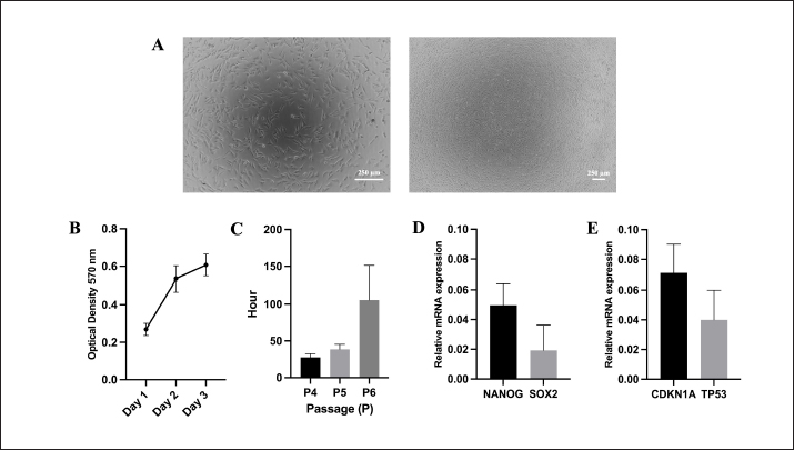Fig. 1. Cell morphology after 24 hours of culturing in the high magnification and low magnification (100× and 40×, respectively). (A) Proliferation assay using MTT assay. (B) PDT. (C) Stemness. (D) Senescence. (E) related marker quantification by RT-qPCR. This current study’s findings revealed the negative expression of hematopoietic surface marker of CD45 and high expression MSC surface makers of CD9, and these results are in agreement with previous results on rabbit adipose MSC obtained from subcutaneous tissue (Koung Ngeun et al., 2023). CD9 is a key player in intercellular communication and is expressed in human MSCs and exosomes produced from MSCs (Hsieh et al., 2021). The first description of a high proportion of CD9 in rabbits was published by Koung Ngeun et al. (2023). The detailed comparison of the current study on the MSC surface markers study compared to other studies is summarized in Table 3. Contrary to previous studies that reported the high expression of CD105, CD90, and CD73 (Tan et al., 2013; Zomer et al., 2018; Almaliotis et al., 2021), these three surface markers were dimly expressed in the current study. It might have occurred due to the discrepancy of antibody used in this study. Similar results were also shown by the previous study on the low expression of CD13, CD133, CD105, CD90, and CD73 MSC surface markers (Martinez-Lorenzo et al., 2009; Lee et al., 2014). The moderate expression of CD49f and CD44 was still lower compared to the previous study (Martinez-Lorenzo et al., 2009; Lee et al., 2014; Tirpakova et al., 2021). CD49f marker (integrin α6) is associated with cell pluripotency (Tirpakova et al., 2021) and has high expression only at early passage (Martinez-Lorenzo et al., 2009). In this study, the expression of CD49f is moderate, which might be caused by the higher passage compared to a previous study (Martinez-Lorenzo et al., 2009). Nonetheless, it is important to note that the discrepancy in cell surface expression of several markers might be affected by substances released by accessory cells during the earlier stages. In addition, the variation of culture and isolation method, species, and tissue origin may play an important role in the discrepancy of the expression of rabbit MSC surface marker (Martinez-Lorenzo et al., 2009).