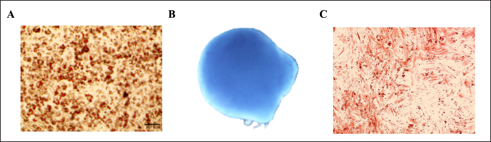 Fig. 3. Multilineage differentiation staining. Adipogenic staining with oil red O revealed red-stained lipid droplets. (A) Chondrogenic staining with Alcian Blue revealed a uniform blue color indicating glycosaminoglycans and cartilage-specific extracellular matrix, (B) whereas osteogenic staining with Alizarin Red revealed a calcium deposit (C).