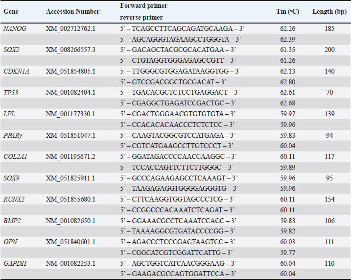 ConclusionIn conclusion, the research offers a comprehensive understanding of the characteristic and differentiation potency of visceral Rab-ADMSC, which has a fibroblast-like shape morphology and plastic adherent. Visceral Rab-ADMSC has the proliferative capability as well as expression of senescence- and stemness-related markers such as NANOG, SOX2, CDKN1A, and TP53. The evaluation of mesenchymal stem cell surface markers reveals that the visceral Rab-ADMSC performs high expression of CD9, moderate expression of CD44 and CD49f, low expression of CD105, CD90, and CD73, and negative expression of CD13 and CD133 as well as CD45 as a hematopoietic stem cell marker. The visceral Rab-ADMSC fulfills the phenotype and genotype characterization multilineage differentiation into adipogenic, chondrogenic, and osteogenic lineage. Thus, this study emphasizes the necessity for the establishment of standard protocols to address the discrepancy of phenotype and genotype characterization of rabbit MSC to support reproducibility in biomedical and translational research. AcknowledgmentThe authors would like to thank the Research Center for Vaccine Technology and Development (RCVTD), Institute of Tropical Diseases, Universitas Airlangga, for providing the facilities for this study. This study was supported by grants from the Directorate of Research, Technology and Community Service, Ministry of Education, Culture, Research and Technology Republic of Indonesia through Regular—Fundamental Research Grant (Penelitan Fundamental – Reguler) 2024 with grant number 1712/B/UN3.LPPM/PT.01.03/2024. Conflict of interestThe authors declare that they have no conflict of interest. FundingThis study was supported by grants from the Directorate of Research, Technology and Community Service, Ministry of Education, Culture, Research and Technology Republic of Indonesia through Regular—Fundamental Research Grant (DRTPM, Penelitan Fundamental – Regular) 2024 with grant number 1712/B/UN3.LPPM/PT.01.03/2024. Authors’ contributionAA: performed the experiment, analyzed data, and wrote the manuscript. SK and WR: designed, conceptualized, and supervised the study, and wrote the manuscript. ISY and LS: performed adipose tissue isolation and conceptualized the study. HS and DD: performed visceral Rab-ADMSC processing, maintained cell culture work, and analyzed the data. All authors have read and approved the final manuscript. Data availabilityAll data are provided in the manuscript. ReferencesAlmaliotis, D., Thomas, A., Komnenou, A., Gounari, E., Almpanidou, S., Siempis, T., Papaioannou, N., Koliakos, G., Papakonstantinou, E., Sotiropulos, K. and Karampatakis, V. 2021. Evaluation of clinical and histological outcomes of adipose-derived mesenchymal stem cells in a rabbit corneal alkali burn model. Stem Cells Int. 2021, 6610023. Calle, A., Zamora-Ceballos, M., Barcena, J., Blanco, E. and Ramirez, M.A. 2022. Comparison of Biological Features of Wild European Rabbit Mesenchymal Stem Cells Derived from Different Tissues. Int. J. Mol. Sci. 23(12), 6420. Cawthorn, W.P., Scheller, E.L. and MacDougald, O.A. 2012. Adipose tissue stem cells meet preadipocyte commitment: going back to the future. J. Lipid. Res. 53(2), 227–246. Chen, G., Zhang, W., Zhang, K., Wang, S., Gao, Y., Gu, J., He, L., Li, W., Zhang, C., Zhang, W., Li, M., Hao, Q. and Zhang, Y. 2020. Hypoxia-induced mesenchymal stem cells exhibit stronger tenogenic differentiation capacities and promote patellar tendon repair in rabbits. Stem Cells Int. 2020, 8822609. Council, N.R. 2010. Guide for the care and use of laboratory animals Eighth Edition (Eighth ed.). Washington, DC: The National Academies Press. Dominici, M., Le Blanc, K., Mueller, I., Slaper-Cortenbach, I., Marini, F., Krause, D., Deans, R., Keating, A., Prockop, D. and Horwitz, E. 2006. Minimal criteria for defining multipotent mesenchymal stromal cells. The International Society for Cellular Therapy position statement. Cytotherapy 8(4), 315–317. Esteves, P.J., Abrantes, J., Baldauf, H.M., BenMohamed, L., Chen, Y., Christensen, N., Gonzalez-Gallego, J., Giacani, L., Hu, J., Kaplan, G., Keppler, O.T., Knight, K.L., Kong, X. P., Lanning, D.K., Le Pendu, J., de Matos, A.L., Liu, J., Liu, S., Lopes, A.M., Mage, R. 2018. The wide utility of rabbits as models of human diseases. Exp. Mol. Med. 50(5), 1–10. Frese, L., Dijkman, P.E. and Hoerstrup, S.P. (2016). Adipose tissue-derived stem cells in regenerative medicine. Transfus. Med. Hemother. 43(4), 268–274. Gao, Y., Chi, Y., Chen, Y., Wang, W., Li, H., Zheng, W., Zhu, P., An, J., Duan, Y., Sun, T., Liu, X., Xue, F., Liu, W., Fu, R., Han, Z., Zhang, Y., Yang, R., Cheng, T., Wei, J. an Zhang, X. 2023. Multi-omics analysis of human mesenchymal stem cells shows cell aging that alters immunomodulatory activity through the downregulation of PD-L1. Nat. Commun. 14(1), 4373. Guneta, V., Tan, N.S., Chan, S.K., Tanavde, V., Lim, T.C., Wong, T.C. and Choong, C. 2016. Comparative study of adipose-derived stem cells and bone marrow-derived stem cells in similar microenvironmental conditions. Exp. Cell Res. 348(2), 155–164. Hsieh, C.C., Hsu, S.C., Yao, M. and Huang, D.M. 2021. CD9 upregulation-decreased CCL21 secretion in mesenchymal stem cells reduces cancer cell migration. Int. J. Mol. Sci. 22(4), 1738. Hu, X., Tang, J., Hu, X., Bao, P., Pan, J., Chen, Z. and Xian, J. 2018. MiR-27b impairs adipocyte differentiation of human adipose tissue-derived mesenchymal stem cells by targeting LPL. Cell Physiol. Biochem. 47(2), 545–555. Jurgens, W.J., Oedayrajsingh-Varma, M.J., Helder, M.N., Zandiehdoulabi, B., Schouten, T.E., Kuik, D.J., Ritt, M.J. and van Milligen, F.J. 2008. Effect of tissue-harvesting site on yield of stem cells derived from adipose tissue: implications for cell-based therapies. Cell Tissue Res. 332(3), 415–426. Kim, J.Y., Park, E.J., Kim, S.M. and Lee, H.J. 2021. Optimization of adipogenic differentiation conditions for canine adipose-derived stem cells. J. 