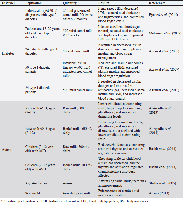 Fig. 3. Schematic illustrating the therapeutic benefits of camel milk. Antitumor actionIn addition, camel milk demonstrates anti-cancer properties. Homayouni-Tabrizi et al. (2016) showed that peptides derived from camel milk, such as NEDNHPGALGEPV (NV-13) and KVLPVPQQMVPYPRQ (KQ-15), are promising for treating oxidative stress disorders. In addition, Khan et al. (2021) discovered that camel milk effectively stopped human hepatoma and breast cancer cells from surviving and growing. It did this by starting both external and internal apoptotic pathways. Research has shown that camel milk LF can effectively hinder approximately 50% of colon cancer cells. It also leads to significant decreases in DNA damage (Muthukumaran et al., 2023), proliferation, viability, and migration of colorectal cancer cells (HCT 116). Furthermore, it activates autophagy, reducing breast cancer cells Michigan Cancer Foundation (MCF-7) (Krishnankutty et al., 2018; Muthukumaran et al., 2023). Liver-protective impactCamel milk has a hepatoprotective effect because of its antioxidant activity (Behrouz et al., 2022; Hassaneen et al., 2023). Furthermore, Abdel-Mobdy et al. (2023) found antioxidant properties in camel milk that can protect against drug-induced liver damage. The increased antioxidant properties of camel milk are attributed to its ability to chelate harmful substances and its high concentration of antioxidant amino acids (Ali et al., 2019b). The histopathological examination of liver tissues revealed that camel milk protects against alcohol-induced cellular damage compared to individuals who did not receive camel milk treatment (Shakeel et al., 2022). Ming et al. (2021) found that camel milk can alleviate alcoholic liver damage by regulating inflammatory factors and correcting immune system dysfunctions. Hao et al. (2022) discovered that camel milk protects against chronic alcoholic liver illness in mice. It protects alcohol-induced intestinal dysfunction and lipid buildup and modulates oxidative stress and inflammatory cytokine release. This demonstrates camel milk’s protective capacity against the harmful effects of alcohol on the liver. Impact on autoimmune conditionsCamel milk can be a substitute therapeutic approach for treating autoimmune illnesses that may impact brain tissues and the gastrointestinal tract (Kocyigit et al., 2024). Researchers primarily attribute the value of camel milk in this context to its abundance of immunoglobulins, specifically IgG, IgM, IgA, and IgD, found in camel serum and camel milk (Swelum et al., 2021; Seifu, 2022). Table 2. The biological properties and mechanisms of action of camel milk.
