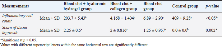Fig. 5. A: Representative photomicrograph of blood clot group showing regions of minor degenerative changes (arrow). B: Representative photomicrograph of the control group (no treatment) showing periapical tissues with dense aggregation of inflammatory cells (yellow arrow), apical closure with cementum like tissue without cementocytes in their lacunae (black arrow). C: Representative photomicrograph of the control group showing bone resorption sites indicated by Howships lacunae and osteoclasts (arrows). D: Representative photomicrograph of the control group showing regions of densely stained basophilic condensation (arrow) (H&E. A and B: ×100, C and D: ×200). In the current study, we used the dog which is one of the most frequently used large-animal models because its dental tissues resemble human tissues in structure and size in addition to the dog’s compliant nature (Wang et al., 2020). Particularly in dentin, there is a great resemblance between dog and human (Dehghani et al., 2019) The rationale behind using dogs in biological endodontics investigations was that their teeth are a lot like human teeth, which makes it possible to conduct tests that mimic real-world clinical settings (El-Tayeb et al., 2019; Abdelsalam et al., 2020; El Halaby et al., 2020; Eldessoky et al., 2022; Talaat et al., 2024). Moreover, information gathered from dogs’ research can be utilized for upcoming human investigations and full orthotopic pulp regeneration (Tawfik et al., 2013; Nakashima et al., 2019; Al-Anesi et al., 2024). Premolars have average-sized canals that allow for endodontic manipulation and are accessible for endodontic operations (Tawfik et al., 2013; Eldessoky et al., 2022). The purpose of inducing periapical infection was to mimic clinical settings, as noted in numerous prior investigations (Tawfik et al., 2013; El-Tayeb et al., 2019; El Halaby et al., 2020; Eldessoky et al., 2022; Talaat et al., 2024). As previously noted, access cavies were left open for a period of 15 days to allow enough time for the development of periapical pathosis (Tawfik et al., 2013; Abdelsalam et al., 2020; El Halaby et al., 2020). After the disinfection process, samples were kept for 15 days, which was enough time to thoroughly disinfect the canals (Sato et al., 1996). For intracanal disinfection during RE operations, Calcium hydroxide is advised (Diogenes and Ruparel, 2017). Consequently, in the current study, it was applied to disinfect the necrotic premolars. Table 1. Mean ± SD values of inflammatory cell count and score of tissue ingrowth in all tested groups.