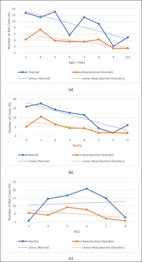 Fig. 3. Distribution of normal reproductive status and reproductive disorders in Bali cattle based on three factors: (a) age, (b) parity, and (c) body condition score (BCS). The study identified anestrus as the most prevalent reproductive disorder, affecting 26.1% of the cattle. Anestrus is often linked to inadequate nutrition, stress, or underlying health issues, which can significantly affect reproductive performance (Hersom, 2014; Mimoune et al., 2021). To mitigate this condition, enhancing the nutritional status of the cows through the incorporation of protein-rich supplements and hormonal treatments such as gonadotropin-releasing hormone is recommended (Hersom, 2014; Borş and Borș, 2021). Additionally, the presence of pyometra in 1.4% of the cattle highlights the need for effective management practices, including improved hygiene during artificial insemination and postpartum care, to prevent such infections that can severely impact reproductive health (Mimoune et al., 2021; Silva et al., 2023). Other reproductive disorders, such as ovarian cysts and inactive ovaries, were observed in 0.7% of the cattle each. The management of these conditions often involves hormonal therapies to induce ovulation and nutritional interventions to improve energy balance (Borş and Borș, 2021; Mimoune et al., 2021). Metritis, found in 0.7% of cows, requires a combination of antibiotic treatment and enhanced postpartum nutrition to prevent its onset (Mimoune et al., 2021; Silva et al., 2023). Previous research results have reported the incidence of reproductive disorders (Budiyanto et al., 2016) reported reproductive disorders in Bali cattle were maintained by an integrated cattle and oil palm system. In dairy cows, cases of reproductive disorders have also been found (Mansur et al., 2020). Reproductive disorders caused by reproductive organ abnormalities were 36.4%. Cases of repeat breeding in dairy cows are 41.6% (Ramadhanty et al., 2020), and delayed puberty in heifers is 44% (Fausiah et al., 2020). The statistical analysis indicated no significant relationship between age and parity with reproductive disorders, which may be attributed to the specific management practices on these farms or the relatively small sample size (Hersom, 2014; Silva et al., 2023). Body condition score emerged as a critical factor influencing reproductive health, with cows maintaining a BCS of 3–4 exhibiting the highest normal reproductive status. This finding reinforces the established understanding that optimal body condition is essential for reproductive efficiency, as both under-conditioned and over-conditioned cows displayed higher incidences of reproductive disorders (Hersom, 2014; Silva et al., 2023). Ensuring balanced nutrition tailored to the reproductive cycle is vital for maintaining optimal body condition and minimizing reproductive issues (Hersom, 2014; Silva et al., 2023). ConclusionThis study provides valuable insights into the reproductive health of Bali cattle on smallholder farms in South Sulawesi, revealing that while a majority of the cattle exhibit normal reproductive status, a significant portion still suffers from reproductive disorders, with anestrus being the most prevalent. The findings underscore the importance of effective reproductive health management, particularly in addressing issues such as poor nutrition and inadequate farm management, which are critical factors influencing the occurrence of reproductive disorders. The analysis also highlights that age, parity, and BCS play crucial roles in the reproductive efficiency of Bali cattle. While older cattle and those with higher parity may be more susceptible to reproductive disorders, optimal body condition is associated with better reproductive outcomes. This emphasizes the need for targeted interventions, including improved nutrition, regular health monitoring, and the application of assisted reproductive technologies to reduce the incidence of reproductive disorders. Overall, this study contributes to the understanding of reproductive challenges in Bali cattle and suggests that with proper management strategies, the reproductive efficiency of cattle can be maintained or even improved, ultimately supporting the sustainability and productivity of smallholder farming systems in Indonesia. AcknowlegmentThe first author is a doctoral student and supported by Beasiswa Pendidikan Indonesia (BPI) No. 2021011222685 Ministry of Education, Culture, Research, and Technology and Lembaga Pengelola Dana Pendidikan (LPDP) Ministry of Finance, Republic of Indonesia. Conflict of interestThe authors declare that there are no conflicts of interest regarding the publication of this manuscript. FundingSupported by Beasiswa Pendidikan Indonesia (BPI) No. 2021011222685 Ministry of Education, Culture, Research, and Technology and Lembaga Pengelola Dana Pendidikan (LPDP) Ministry of Finance, Republic of Indonesia. Authors’ contributionsM. Mansur has contributed in conception and design the study, collecting and data analysis, and drafted the manuscript; A.L Toleng supervised the experiments, and drafted the manuscript; M. Yusuf collecting and data analysis, and drafted the manuscript; J.A. Syamsu have contributed in conception and design the study; Hasrin have contributed in collecting and data analysis and improvement of the manuscript. Data availabilityAll data are provided in the manuscript. ReferencesBorş, S.I., and Borș, A. 2021. Adapting the treatment of ovarian cysts according to their type in dairy cattle. J. Appl. Life Sci. Environ. 54(1), 77–84. Budiyanto, A., Tophianong, T.C., Triguntoro. and Dewi, H.K. 2016. Bali cattle reproductive disorders of semi intensive management in the area of cattle oil palm integration system. Acta Vet. Indones. 4(1), 14–18. Dairoh, D., Jakaria, J., Ulum, M. F. and Sumantri, C. 2021. A New SNPs at 3’UTR region of calpain 1 gene and its association with growth and meat quality traits in beef cattle. J. Indonesian Tr