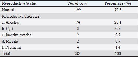 Fig. 2. Reproductive status of Bali cows in kept under smallholder farms. Table 1. The status of Bali cattle experiencing reproductive disorders.
