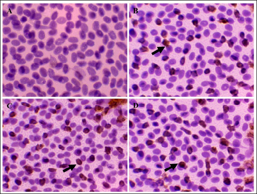 Fig. 2. Immune-expression of COX-2 on cell tube block of ranchu goldfish blood. No COX-2 immune-expression was found in the control without primary antibody (A); COX-2 immuneexpression (arrows) on the nucleus of leucocytes of group P2 fed with CMC-Na (B); group P3 fed with Power C® (C); group P6 fed with 0.6% BFE (D). Immunohistochemistry of antiCOX-2 antibody, 1000×. Moreover, the BFE is also influencing on the RBC level in ranchu goldfish. A previous study by Sharifzadeh et al. (2015) described that α-tocopherol compounds can increase erythropoiesis in hematopoietic tissues. α-tocopherol can also prevent phospholipid peroxidation in the erythrocyte membrane, thus maintaining the structural and functional integrity of fish’s blood cells (El-Sayed and Izquierdo, 2022). In contrast, the PCV level did not significantly increase, although it is trending upward in the treated group. The relatively low PCV value in the untreated group indicates that the fish are suffering from oxidative stress, which shows high MDA values (Sharma and Chadha, 2021). In this study, the WBC, lymphocytes, and monocyte values did not show significant changes except for heterophiles. The heterophils in P6 showed the lowest level, contrasting with the group without therapy. The occurrence of heterophils elevation concomitantly depresses the number of circulatory lymphocytes in the early stage of inflammation during vitamin E deficiency (de Andrade Belo et al., 2014; Klak et al., 2024). The high levels of BFE in feed supplementation can help maintain the stability of leucocytes, lymphocytes, monocytes, and heterophils (Mazini et al., 2022). Compounds of α-tocopherol were found to increase the levels of lymphocytes and monocytes in goldfish. The differences in the results of these studies are believed to be due to variations in the concentration of α-tocopherol used. CD4+ is a type of protein found on the surface of T-cells (Ashfaq et al., 2019). An immunohistochemical examination (Fig. 1) revealed high levels of CD4+ in group P6 compared to P2 and P3. CD4+ lymphocytes are vital in coordinating the immune response by serving as helper cells (Iqbal et al., 2023). Statistically, there was a significant increase in CD4+ values in P3, P4, P5, and P6 compared to P1 and P2, although there was no significant increase in lymphocyte values. The compound α-tocopherol can enhance LAT phosphorylation, which aids in recruiting adaptor and effector proteins crucial for modulating the early stages of Th-cell activation, thereby increasing the percentage of CD4+ (Tang et al., 2024). Consequently, while the total lymphocyte count did not increase, the expression of CD4+ did. Table 4. Mean and standard deviation of CRP and immune-expression of CD4+, COX-2 and ratio of CD4+/COX-2 results of ranchu goldfish.