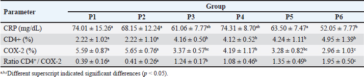 COX-2 is a biomarker for inflammation; an increase in COX-2 indicates inflammatory processes (Olsen et al., 2012). In this study, the COX-2 value in the P1 group was significantly higher than in P6 (Fig. 2). This was due to the α-tocopherol compound. α-tocopherol can reduce the activity of COX-2 and inhibit the synthesis of prostaglandin E2 (PGE2) (Li et al., 2023). Inhibition of PGE2 synthesis reduces the inflammatory response, especially heterophils, which act as the immune system’s first line (Roy et al., 2017). This correlates with the study, indicating a significant decrease in heterophils in the P6-treated group using the highest BFE concentration. A decrease in the value of heterophils reduces the formation of oxidative stress (Guo et al., 2023). Furthermore, the increased immunoreactivity of CD4+ and the decreased levels COX-2 work together to raise the CD4+/COX-2 ratio. The rationale behind this parameter is that a higher CD4+/COX-2 ratio indicates better immunity and vice versa. This is similar to the findings of Ashfaq et al. (2019), who described that elevated expression of CD4+ promotes immunity in teleost fish, while depletion of COX-2 improves the quality of the fish’s immune system. Additionally, Wang et al. (2016b) added that COX-2, involved in prostaglandin synthesis, is a crucial factor in promoting stress in Larmichthys crocea. A decrease in heterophils determines that fewer cytokines are produced, so hepatocyte cells are not stimulated to produce acute-phase proteins. CRP is the acute-phase protein produced during the initial inflammation (Charlie-Silva et al., 2019; Bello-Perez et al., 2020). CRP, an acute-phase protein, helps bacterial agglutination, phagocytosis, and modulation of inflammation during infection (Li et al., 2022). In this study, the CRP results in the P6 group were lower than in P1. Increased immunity helps fish avoid oxidative stress, thus increasing the growth rate. Moreover, Rahman et al. (2023) described that the right concentration of α-tocopherol compounds improves immunity, stress tolerance, and body performance. This study suggests that BFE can be utilized in aquaculture as an immunostimulant through simple methods, such as food coating. However, further research is needed to explore its other positive effects and potential toxicity in aquaculture to ensure the biosafety of using BFE. Enhancing BFE in aquaculture could involve developing new ready-to-use formulations that are easier for farmers to apply. ConclusionThis study demonstrates that coating fish feed with 0.6% BFE significantly enhances the performance and immunity of ranchu goldfish. Notable improvements were observed in growth parameters, including final weight, absolute weight gain, and specific growth rate. Additionally, hematological benefits were evident, with increased RBC counts and CD4+ lymphocytes, alongside reductions in heterophils, CRP, and COX-2 levels, indicating reduced inflammation and oxidative stress. Further research is needed to explore the potential of BFE as a supplement in fish feed to combat various fish diseases and fish species in real-world or laboratory settings and also the effects of long-term utilization of BFE. AcknowledgmentsThe authors acknowledge the Universitas Gadjah Mada for providing the financial support for this study through Final Project Recognition Program, with grant number: 5286/UN1.P1/PT.01.03/2024. Moreover, the laboratory technicians from Integrated Laboratory, University of Muhammadiyah Sidoarjo were acknowledged for their support in conducting the study. Conflict of interestThe authors have no conflict of interest. FundingThis study received financial support from Universitas Gadjah Mada through Final Project Recognition Program, with grant number: 5286/UN1.P1/PT.01.03/2024. Authors’ contributionFLW and ADW designed the study. FLW, YAP, and ADW performed the animal experimentation. FLW formulated, prepared, and preserved the tested compound. FLW and YAP performed data analysis and interpretation. FLW, YAP, and ADW equally contributed to the drafting, revising, and finalizing of the submitted paper. All the authors approved the current version of the paper. Data availabilityAll the data in this study are available within the manuscript. ReferencesAnjur, N., Sabran, S.F., Daud, H.M. and Othman, N.Z. 2021. An update on the ornamental fish industry in Malaysia: Aeromonas hydrophila-associated disease and its treatment control. Vet. World. 14(5), 1143–1152. Anjusha, K.V., Mamun, M.A.A., Dharmakar, P. and Shamima, N. 2019. Effect of medicinal herbs on hematology of fishes. Int. J. Current. Microbiol. Appl. Sci. 8(9), 2371–2376. Ashfaq, H., Soliman, H., Saleh, M. and El-Matbouli, M. 2019. CD4: a vital player in the teleost fish immune system. Vet. Res. 50, 1–11. Bello-Perez, M., Pereiro, P., Coll, J., Novoa, B., Perez, L. and Falco, A. 2020. Zebrafish C-reactive protein isoforms inhibit SVCV replication by blocking autophagy through interactions with cell membrane cholesterol. Sci. Rep. 10(1), 566. Boakye, A., Attiogbe, F. and Emahi, I. 2024. Crescentia cujete fruit shell as green and efficient coagulant for water purification. Clean. Water. 1, 100009. Canosa, L.F. and Bertucci, J.I. 2023. The effect of environmental stressors on growth in fish and its endocrine control. Front. Endocrinol. 14, 1109461. Charlie-Silva, I., Klein, A., Gomes, J.M., Prado, E.J., Moraes, A.C., Eto, S.F., Fernandes, D.C., Fagliari, J.J., Junior, J.D.C., Lima, C. and Lopes-Ferreira, M. 2019. Acute-phase proteins during inflammatory reaction by bacterial infection: fish-model. Sci. Rep. 9(1), 4776. Darnet, S., Serra, J.L., da Cruz Rodrigues, A.M. and da Silva, L.H.M. 2011. A high-performance liquid chromatography method to measure tocopherols in assai pulp (Euterpe oleracea). Food Res. Int. 44(7), 2107–2111. de Andrade Belo, M.A., de Moraes, F.R., Yoshida, L., da Rosa Prado, E.J., de Moraes, J.R. E., Soares, V.E. and da Silva, M.G. 2014. Deleteri