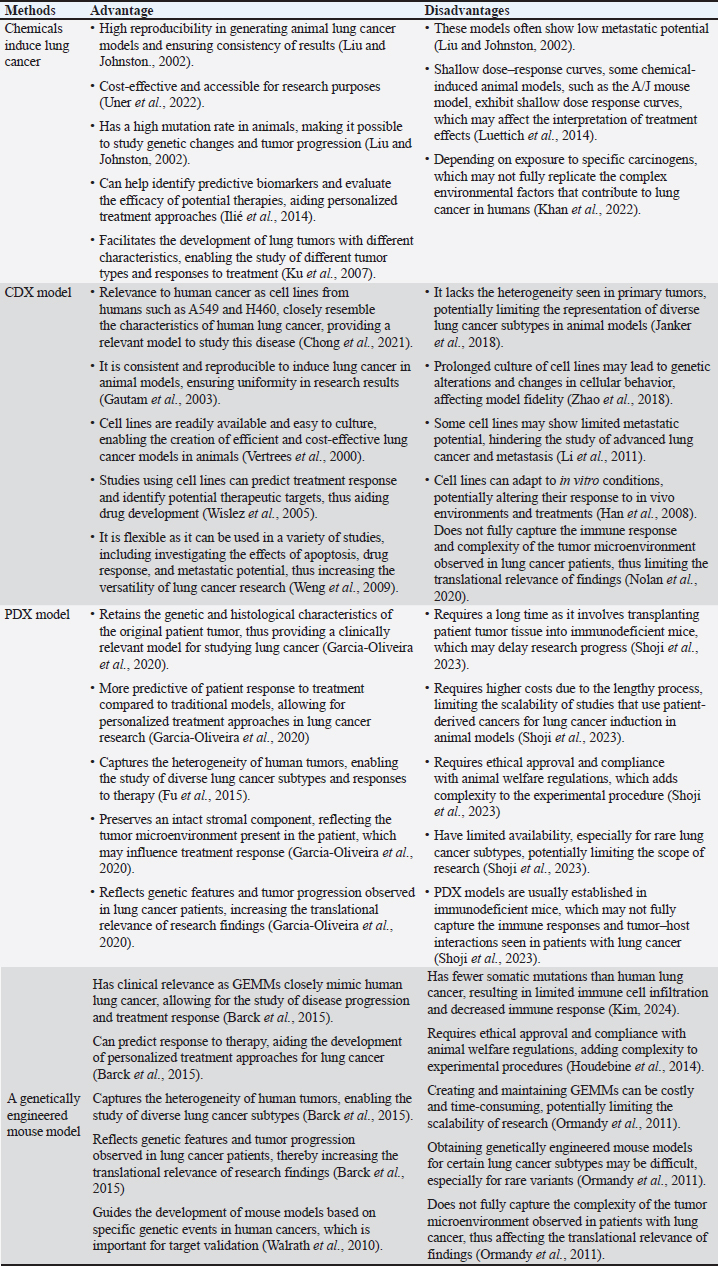 Future perspectiveThe results in this review indicate that mouse models predominantly used in cancer research, particularly in the study of lung cancer. The use of mice as a lung cancer model is because mice have the advantage of genetic tractability and the ability to modify different biological pathways. Nevertheless, these models possess notable constraints that can impact the applicability of results to human patients. A significant drawback of mice models is their inability to completely mimic the genetic and phenotypic diversity exhibited in human lung cancer. Moreover, the immune system of mice, especially in models with reduced immunity, fails to replicate the immunological response observed in humans accurately. The constraint above can substantially influence the examination of interactions between tumors and the immune system and the effectiveness of immunotherapies (Weiss et al., 2015). In order to address this constraint, there is a continuous effort to establish a wider range of animal species as models for studying lung cancer. This novel method is essential for enhancing the disease’s comprehension mechanism and therapy solutions. Moreover, applying genetic engineering, environmental factors, and lifestyle factors in these models will increase their significance and effectiveness in preclinical research, ultimately leading to improved outcomes for individuals with lung cancer. Understanding the interactions between tumor cells, stroma, and microenvironment, which are included in molecular carcinogenesis, is critical for developing effective therapies. Research into the role of immune cells, fibroblasts, and ECM components in lung cancer can provide insights into how these interactions influence tumor growth and metastasis (Pullamsetti et al., 2017). Targeting these interactions may enhance existing therapies’ effectiveness and lead to new treatment strategies. Moreover, as a new approach to treatment strategies, the use of herbal medicine, it is possible to employ phytoconstituents of OS in lung cancer, deeper research involving the use of various animal models and new technologies such as organoids and organs on a chip, is needed related to the functional mechanism, standardization of dosages, and regulations on the use of herbal medication. ConclusionRecently, mice have been used extensively as experimental models for lung cancer. Chemically induced mice, lung cancer cell line induction, PDXs, and genetically modified mice are some of the manufacturing techniques used. It is crucial to apply the strategy of using molecular carcinogenesis interactions, such as tumor microenvironment, genetic mutation, and epigenetics, to improve the efficacy of therapy and encourage the development of novel treatment modalities, particularly those involving herbal medicine. One of the most widely used herbal remedies in Southeast and South Asia is OS. Lung cancer therapy and prevention heavily depend on OS. OS possesses antioxidant, anti-inflammatory, immunomodulatory, antiproliferative, proapoptotic, antiangiogenic, and antimetastatic qualities, which account for its reported chemopreventive and anticancer therapeutic benefits. Furthermore, OS has the ability to control enzymatic activity, including GSH, GST, GSH-Px, and several antioxidant enzymes such as SOD and CAT, as well as signal transduction pathways. AcknowledgmentsThe authors would like to thank the Integrated Laboratory for Research and Testing, Universitas Gadjah Mada, for providing the facilities for this study. This study was supported by grants from the Directorate of Research, Universitas Gadjah Mada through Thesis Recognition Grant 2024 (Rekognisi Tugas Akhir-RTA 2024) with grant number 5286/UN1. P1/PT.01.03/2024. Conflict of interestThe authors declare that they have no conflict of interest FundingThis study was supported by grants from the Directorate of Research, Universitas Gadjah Mada through Thesis Recognition Grant 2024 (Rekognisi Tugas Akhir-RTA 2024) with grant number 5286/UN1.P1/PT.01.03/2024. Authors’ contributionsConceptualized and Supervision: H.W., D.L.K., D and .A.A.N., Methodology: H.W., Writing-original draft: U.K., H.W., D.L.K., and D.A.A.N.; Writing-review and editing: H.W. and U.K.; Visualized: U.K. and H.W. All authors have read and approved the final manuscript. Ethical approvalSince this review does not use materials obtained directly from humans or animals, there is no need for ethical clearance. ReferencesAksorn, N. and Chanvorachote, P. 2019. Integrin as a molecular target for anti-cancer approaches in lung cancer. Anticancer Res. 39(2), 541–548. Ali, Z., Mukwaya, A., Biesemeier, A., Ntzouni, M., Ramsköld, D., Giatrellis, S., Mammadzada, P., Cao, R., Lennikov, A., Marass, M., Gerri, C., Hildesjö, C., Taylor, M., Deng, Q., Peebo, B., Peso, L. del, Kvanta, A., Sandberg, R., Schraermeyer, U., Andre, H., Steffensen, J.F., Lagali, N., Cao, Y., Kele, J. and Jensen, L.D. 2019. Intussusceptive vascular remodeling precedes pathological neovascularization. Arterioscler. Thromb. Vasc. Biol. 39(7), 1402–1418. Almatroodi, S.A., Alsahli, M.A., Almatroudi, A. and Rahmani, A.H. 2020. Ocimum sanctum: role in diseases management through modulating various biological activity. Phcog. J. 12(5), 1198–1205. Anand, P., Kunnumakara, A.B., Sundaram, C., Harikumar, K.B., Tharakan, S.T., Lai, O.S., Sung, B. and Aggarwal, B.B. 2008. Cancer is a preventable disease that requires major lifestyle changes. Pharm. Res. 25(9), 2097–2116. Arfan, A. and Andarini, S.L. 2022. Role of miRNA in non-small cell lung carcinoma. Res. Sci. 2(3), 165–174. Avraamides, C.J., Garmy-Susini, B. and Varner, J.A. 2008. Integrins in angiogenesis and lymphangiogenesis. Nat. Rev. Cancer. 8(8), 604–617. Bachmann, M., Kukkurainen, S., Hytönen, V.P. and Wehrle-Haller, B. 2019. Cell adhesion by integrin. Physiol. Rev. 99, 1655–1699. Bao, P., Kodra, A., Tomic-Canic, M., Golinko, M.S., Ehrlich, H.P. and Brem, H. 2009. The role of va